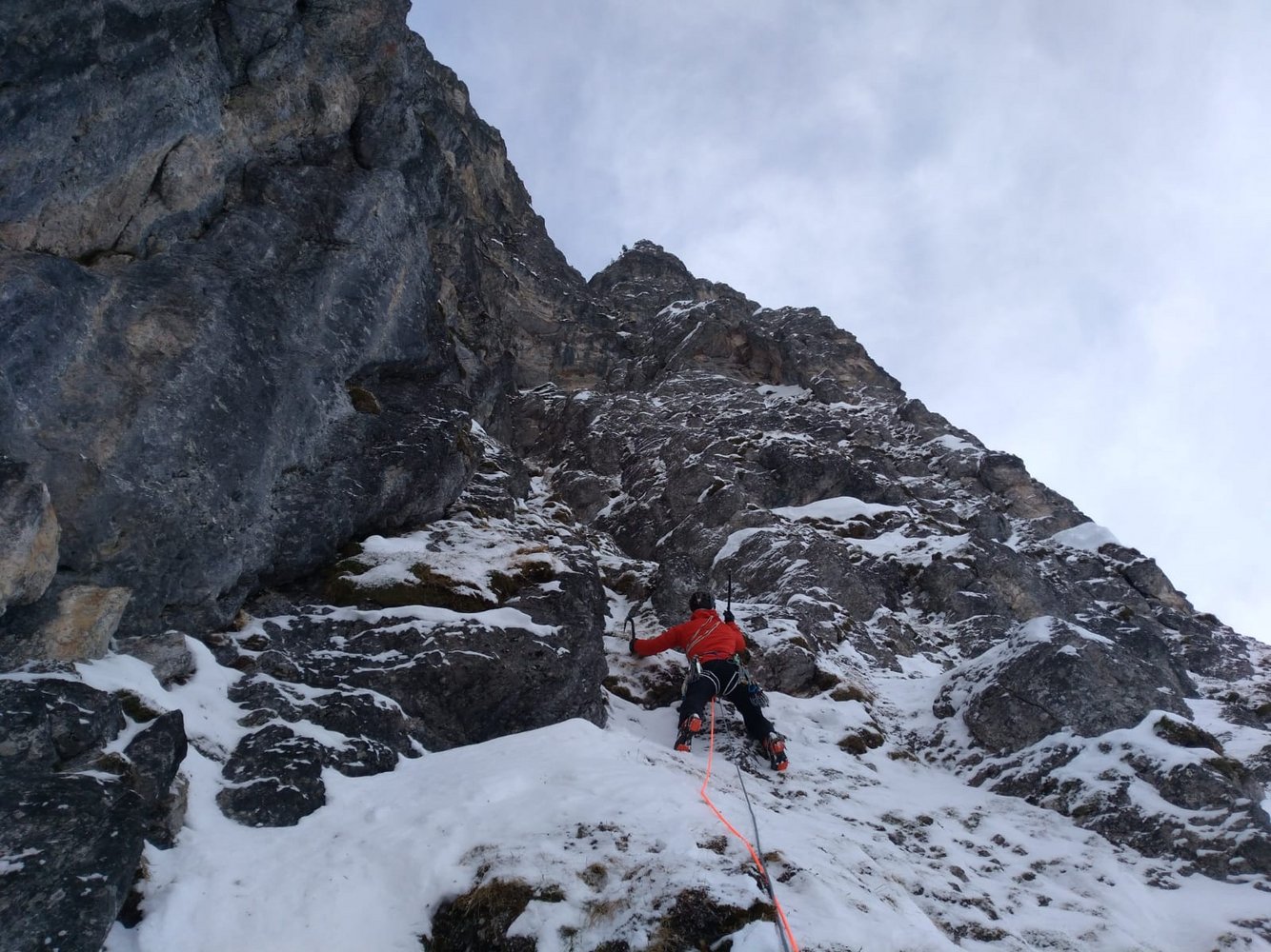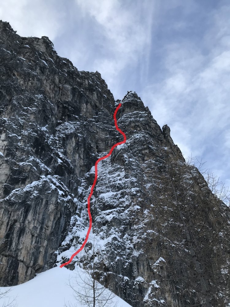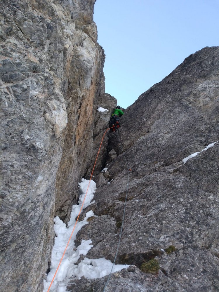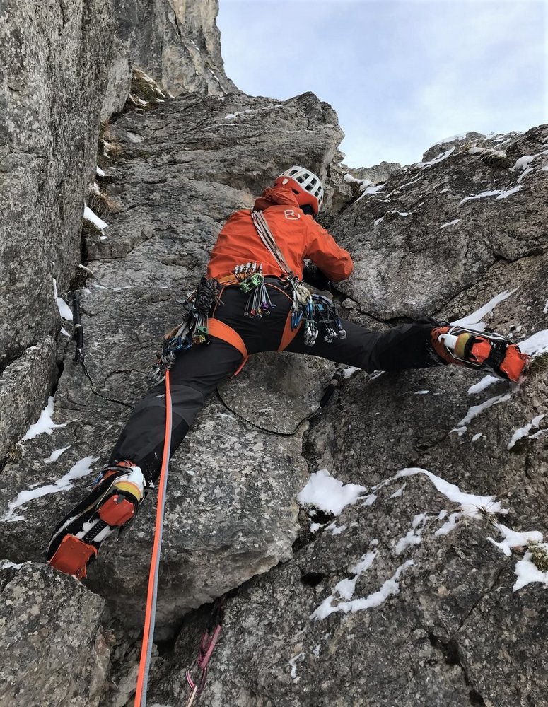Ernste, bohrhakenfreie Route, die ein gutes Maß an Erfahrung im Umgang mit mobilen Sicherungsmitteln erfordert. Ansonsten großteils spaßige Kletterei an gefrorenen Graspolstern, die mit wenigen Ausnahmen gut mit mobilen Gerätschaften abgesichert werden kann.