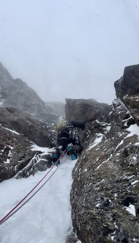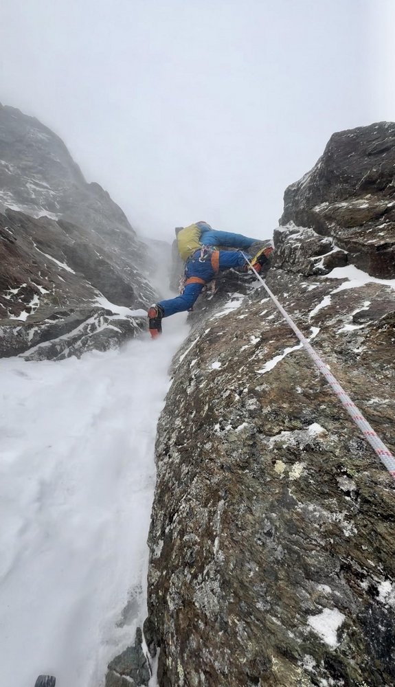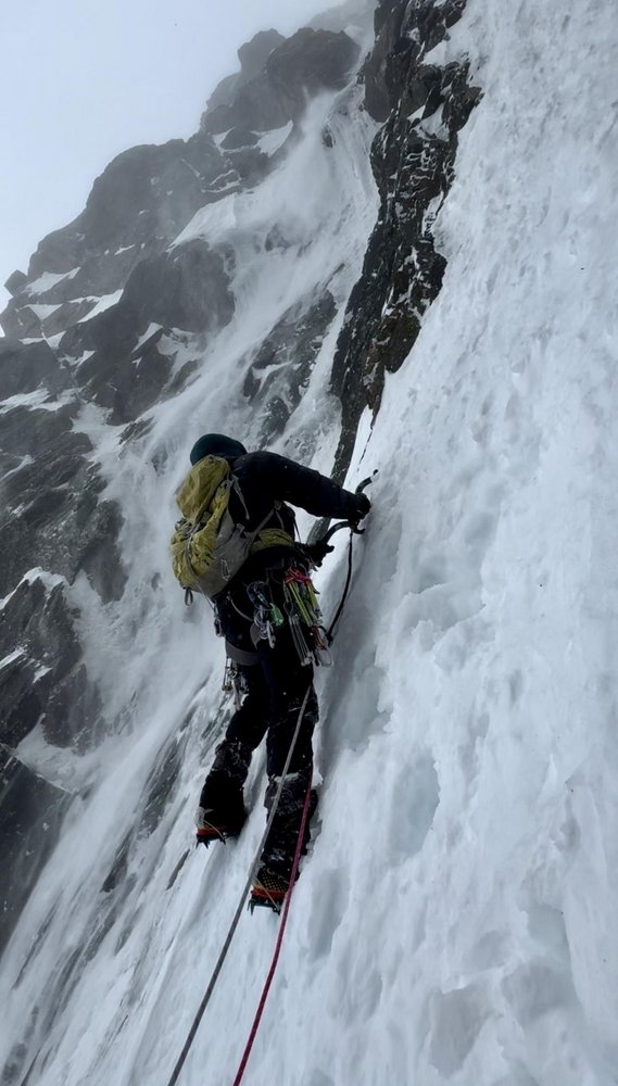 Seillängen 4–5: Logischer Aufstieg durch abwechselnd Fels- und Eisstufen (WI3 / M3) zum Hauptschneefeld unterhalb des Gipfelaufbaus.