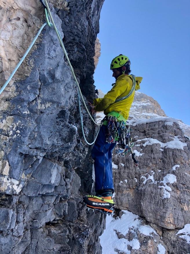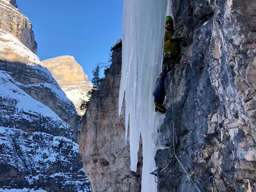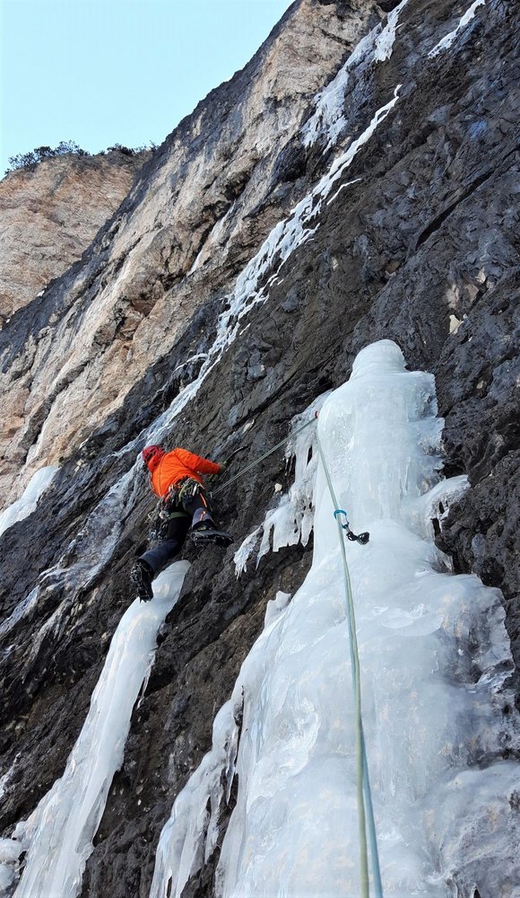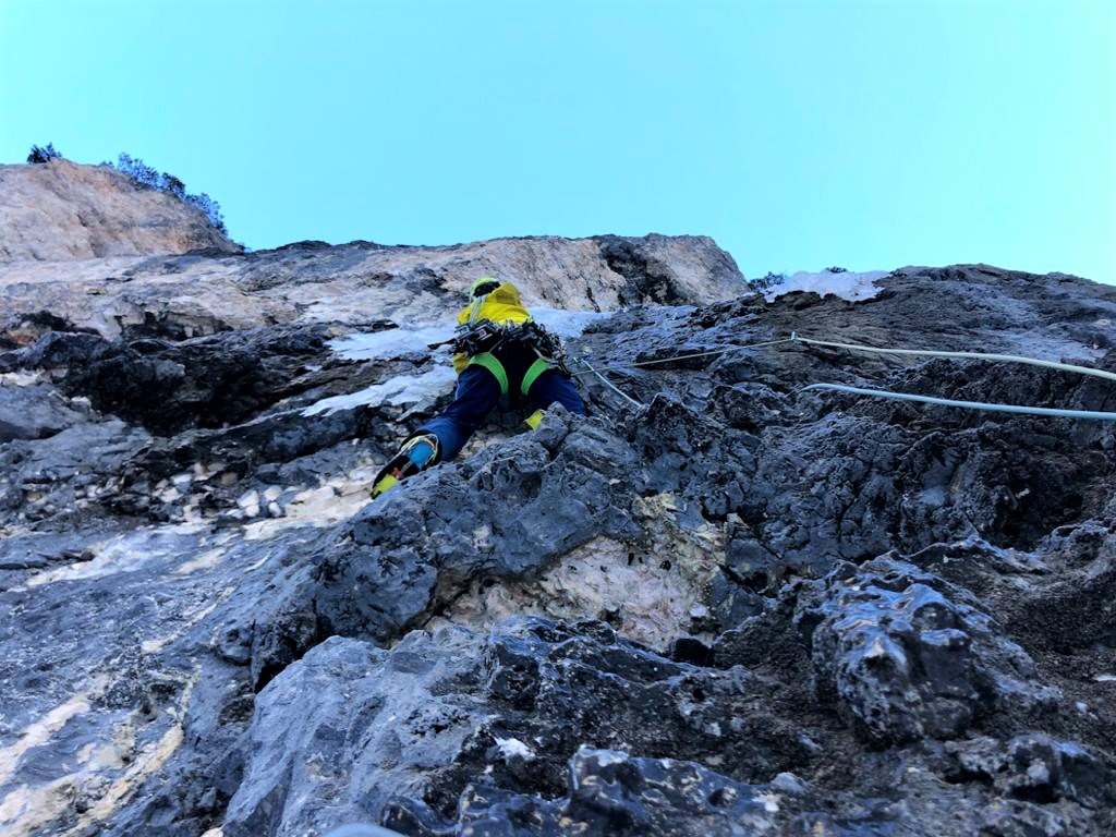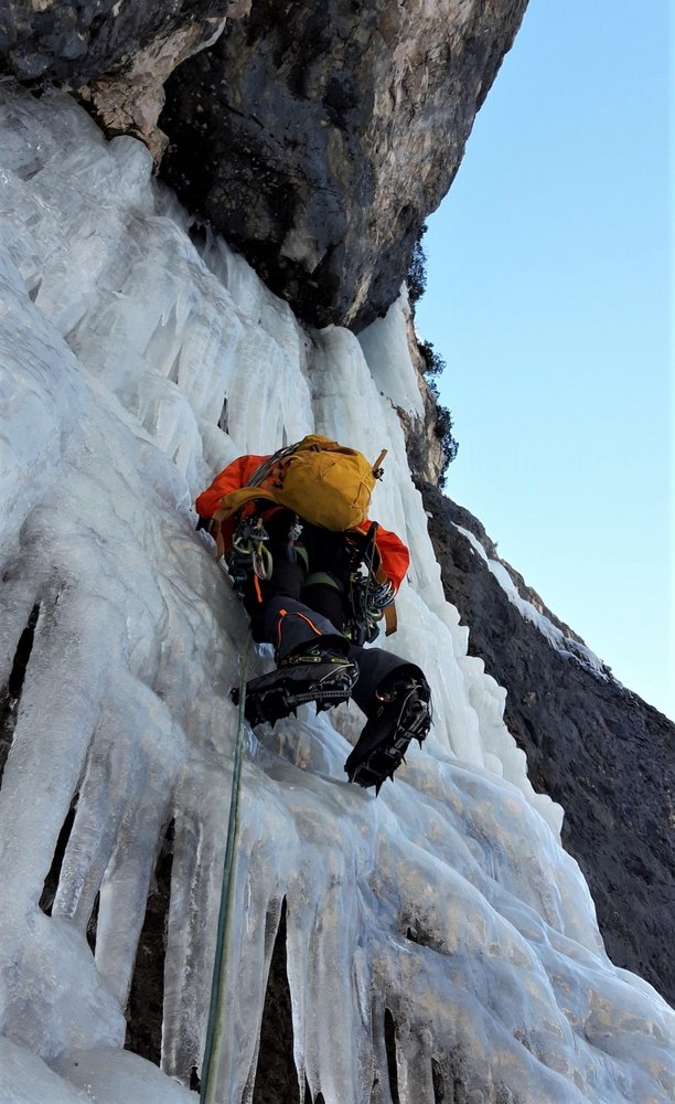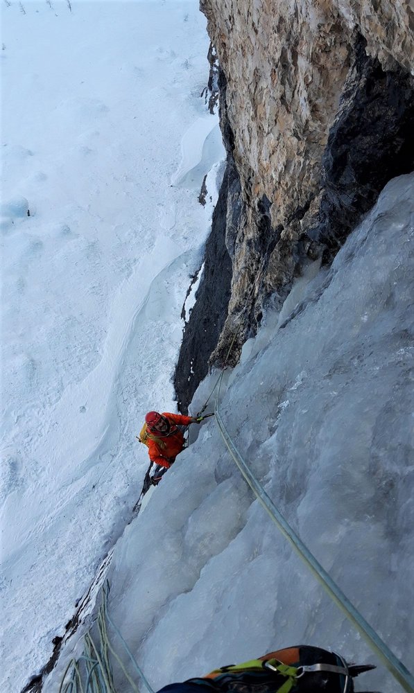 Schöne Mixedkletterei in herrlicher Umgebung, je nach Eisbildung nicht immer leicht abzusichern.