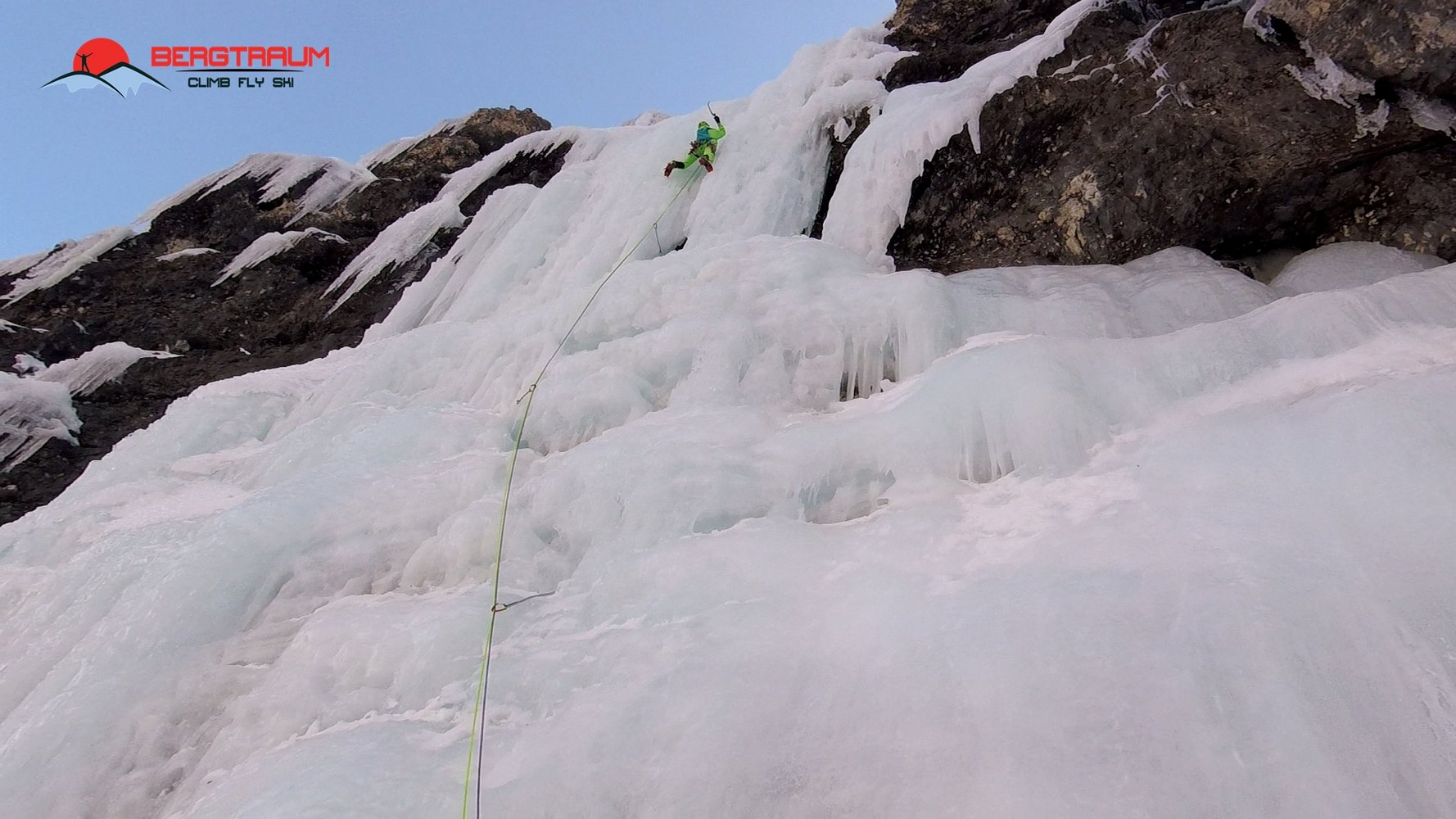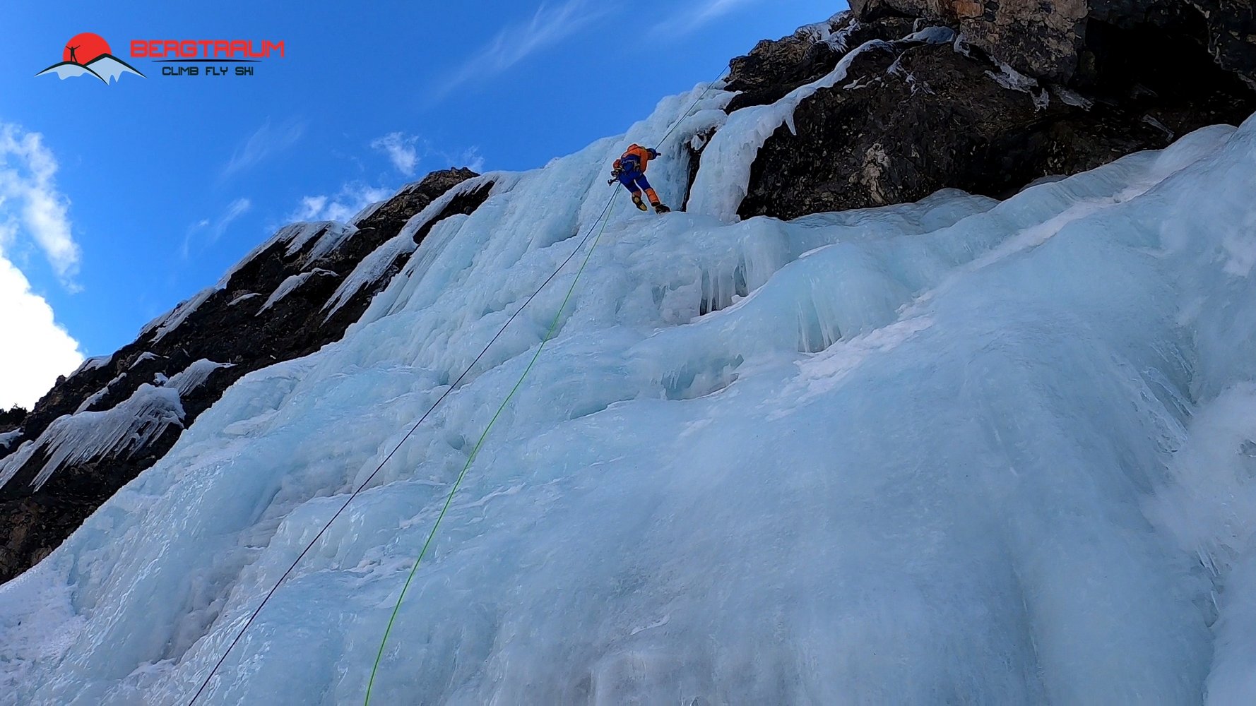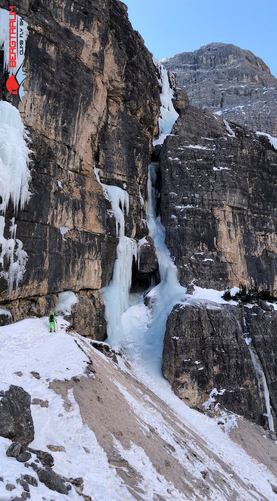 Toller Eisfall in einer wunderschönen Umgebung- Zustieg kann je nach Schneeverhältnissen lang und etwas unbequem sein. Mehrere Möglichkeiten zum Klettern ab der dritten Seillänge. Der Beginn durch den Kamin kann bei wenig Eis eine durchaus fordernde Mixedkletterei sein.