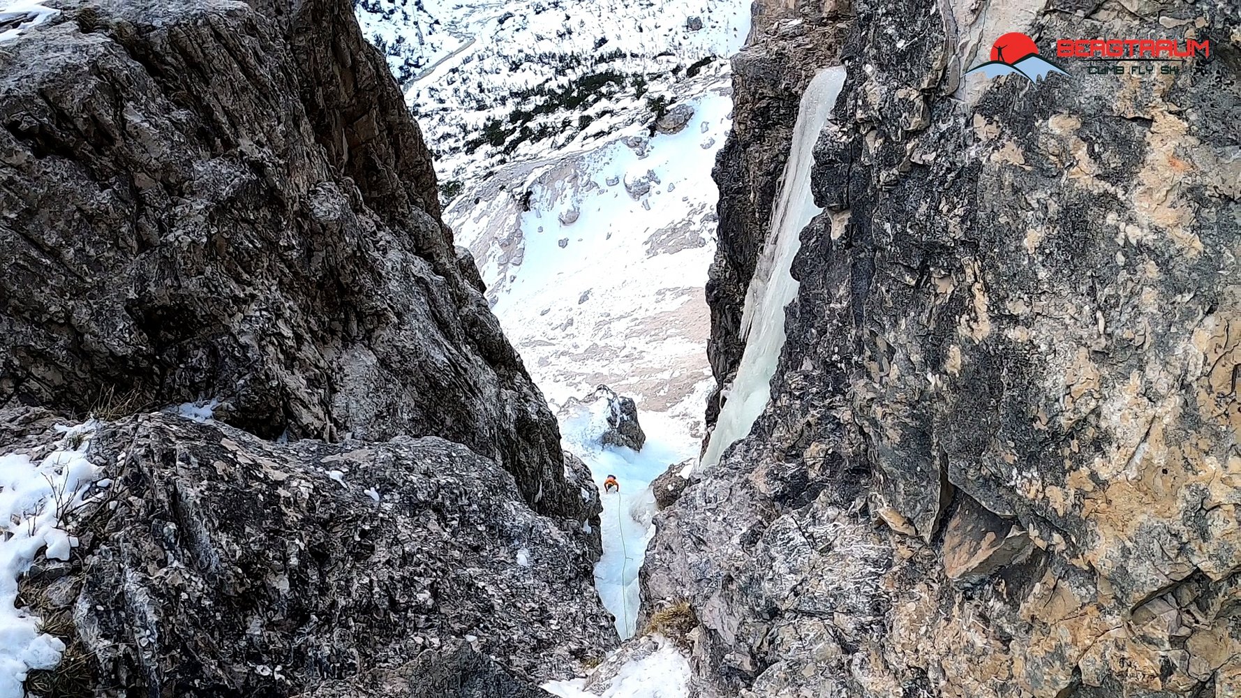 Durch den schluchtartigen Kamin und einem Durchschlupf unter Klemmblock zu Stand an zwei Bolts (WI 4+, 60 m). Dann Stapfgelände über Schneerampe und leichtem Eis zu Stand unter Steilstufe (WQI 2, 100 m). Die Steilstufe rauf in flaches Gelände (WI 4+, 50 m). Weiter recht flach zur letzten Stufe (WI1-2, 40 m). Die Abschlussstufe (mehrere Varianten) rauf zum Ende der Tour (WI 4, 50 m).
