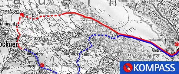 Auf dem meist gespurten Normalweg (in südostlicher Richtung) über den Kleinglockner (3770 m) und das Glocknerleitel hinunter zur Adlersruhe (3451 m). Von dort über das Hofmannskees (Spalten) zur Pasterze hinab und wieder zur Tiefgarage aufsteigen.