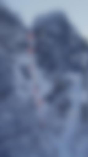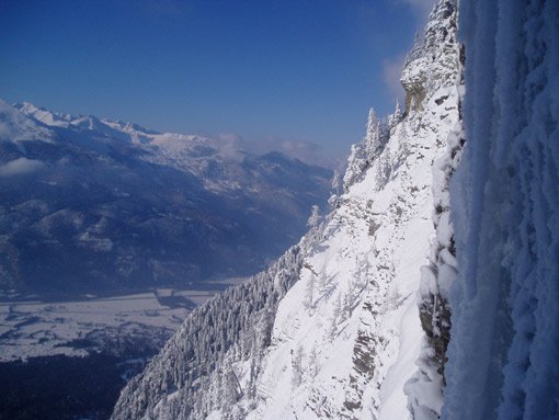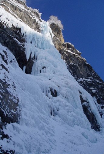 Zustieg über stark lawinengefährdete Rinne. Kletterei an mannshohen, teilweise überhängenden Eisbalkonen und freistehenden Eisschuppen..