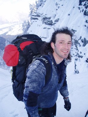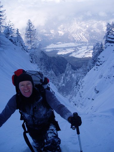 Zustieg über stark lawinengefährdete Rinne. Als in der 4. Länge ein größerer Eisbalkon abbrach, löste dieser im flachen Teil der 2. Länge eine Lawine aus, die die gesamte Zustiegsrinne ausräumte. Unser verschüttetes Rucksackdepot am Rand des Grabens fanden wir nur aufgrund unserer Markierungen mit den Skistöcken wieder.