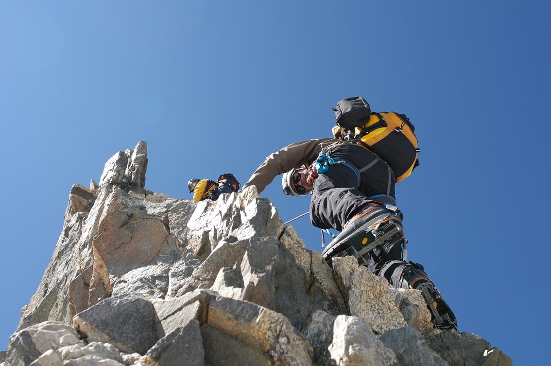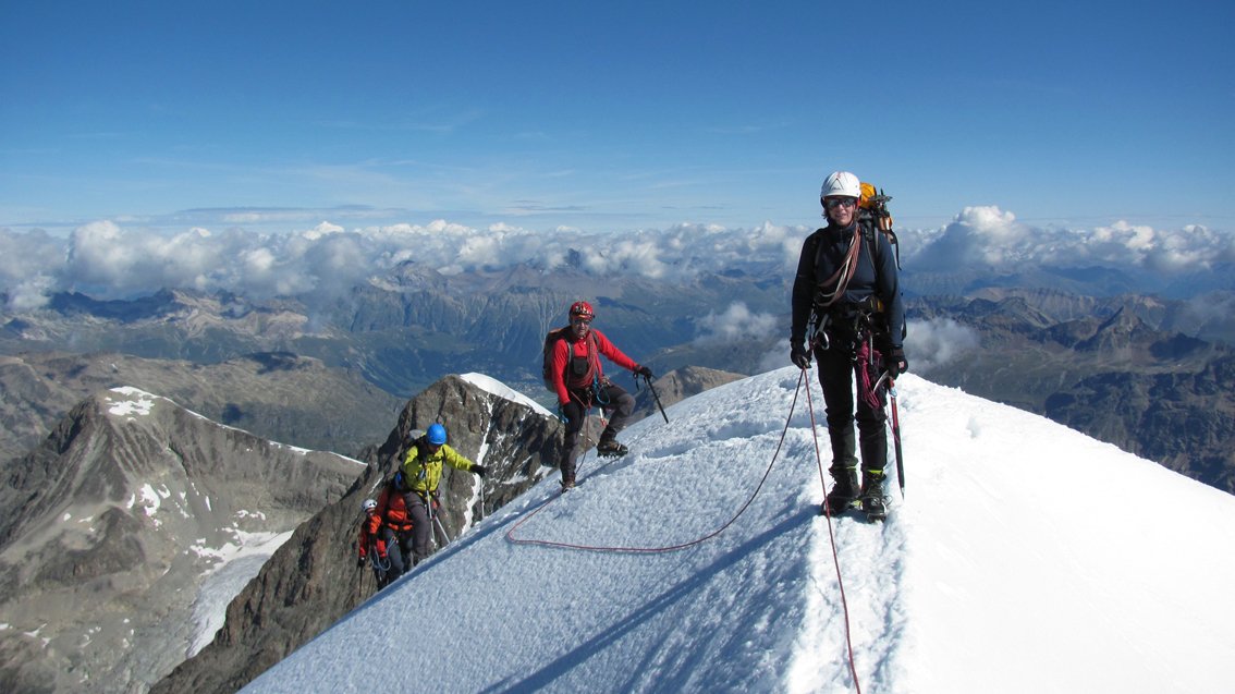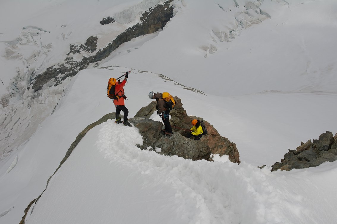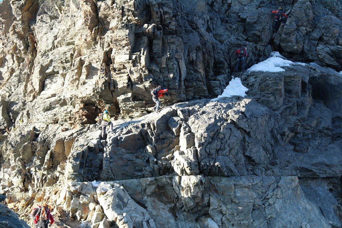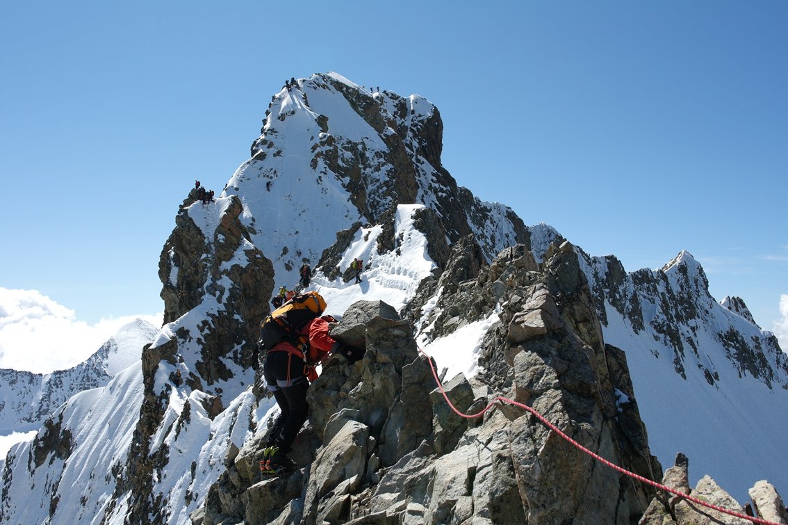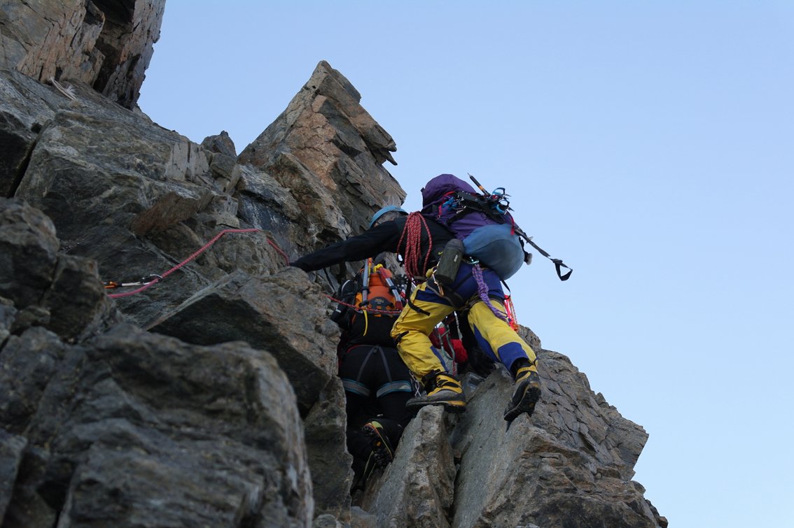 Neben dem Grat sind auch kombinierte Stellen (Fels/Eis bzw. Fels/Firn) zu bewältigen.