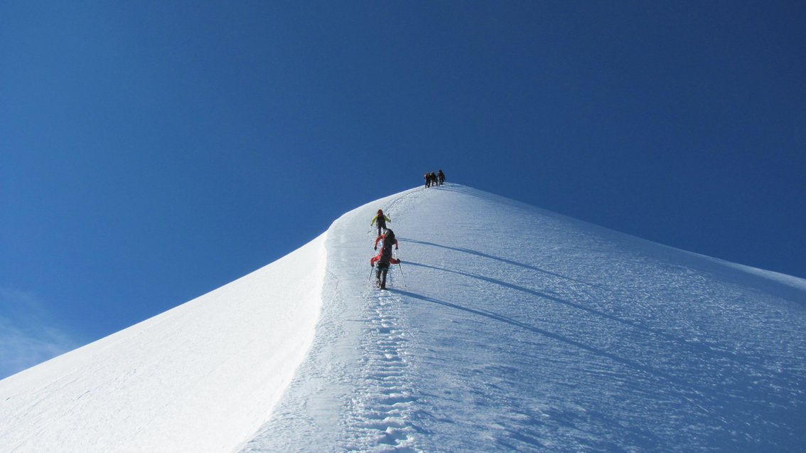 Der Biancograt ist eine der ästhetischsten Touren in den Alpen, kaum ein anderer Anstieg hat so viel Ausstrahlung wie die weiße Gratschneide an der Nordseite des Piz Bernina. Der auch als "Himmelsleiter" bezeichnete Grat hat bis heute nichts an seiner Beliebtheit verloren und wird an schönen Tagen von unzähligen Bergsteigern begangen. Der eigentliche Firngrat ist das Mittelstück der Tour. Er wird von einem steilen Felsstück (früher stieg man unten direkt im Eis auf) unten und einem Zackengrat oben begrenzt.