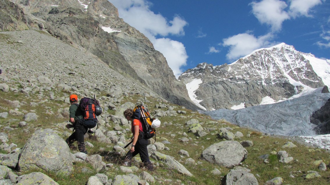 Zustieg zur Tschierva Hütte: Vom Parkplatz in Pontresina erst lange flach (beschildert, Fahrrad nützlich) in das Val Roseg gehen, bis der Wanderweg zur Tschierva Hütte beginnt. Weiter auf dem Weg hinauf zur Hütte. Gesamt ca. 700 Hm; 3,5 Stunde bis zur Hütte.