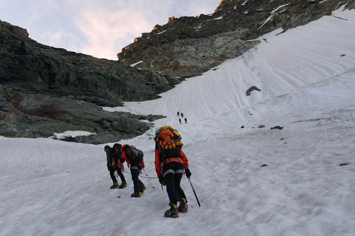Von der Hütte bis zum Gipfel sind es ca. 1650 Hm; es muss mit einer Gesamtzeit von ca. 9-12 Stunden von der Tschierva Hütte bis zum Rif. Marco e Rosa gerechnet werden. Bei viel Betrieb oder schlechten Verhältnissen dauert es natürlich länger.