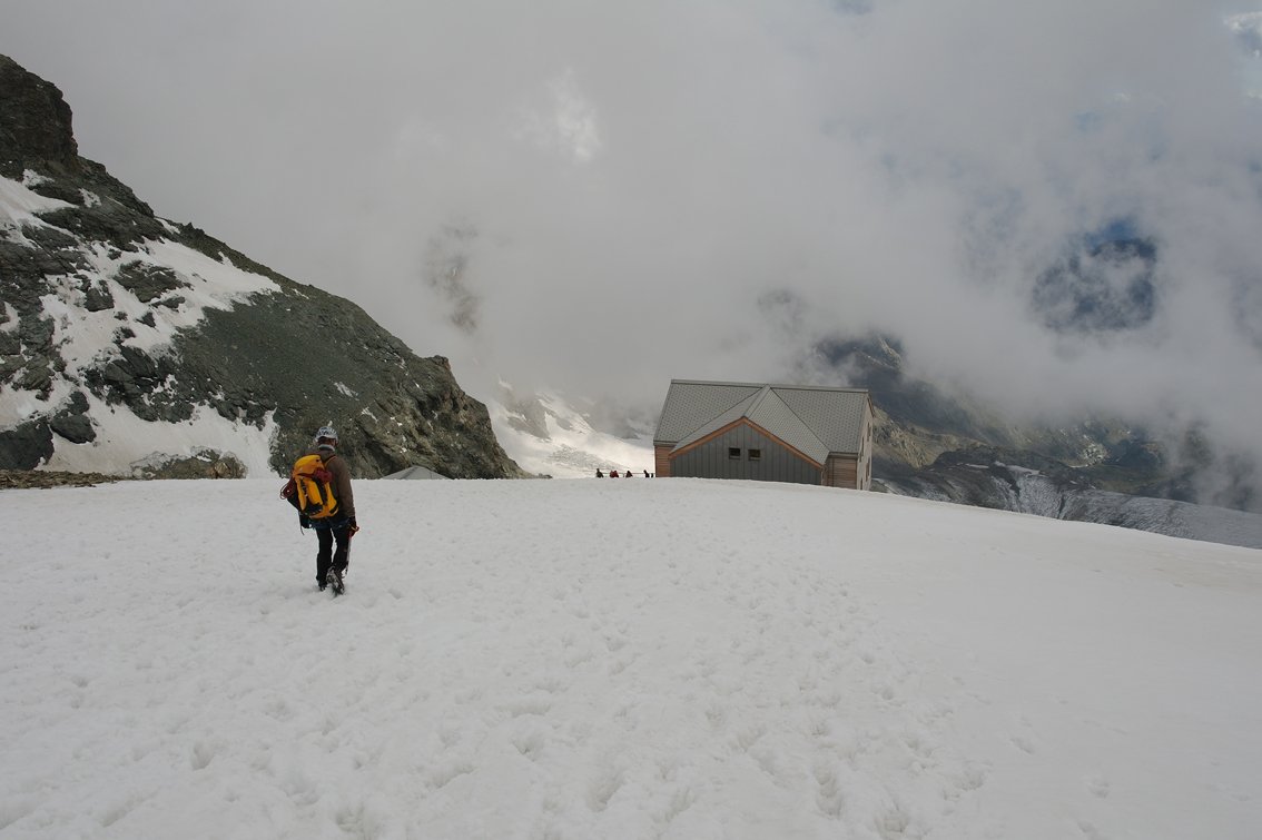 Vom Gipfel des Piz Bernina steigt man anfangs im Fels zu einem Firngrat (ein Felsaufschwung wird meist links umgangen). Dort wo der Grat steil abbricht befindet sich die erste Abseilstelle. Nach den Abseilern geht man auf dem flacher werdenden Gletscher zur Marco e Rosa Hütte. Bis dorthin ca. 2,5 Stunden.