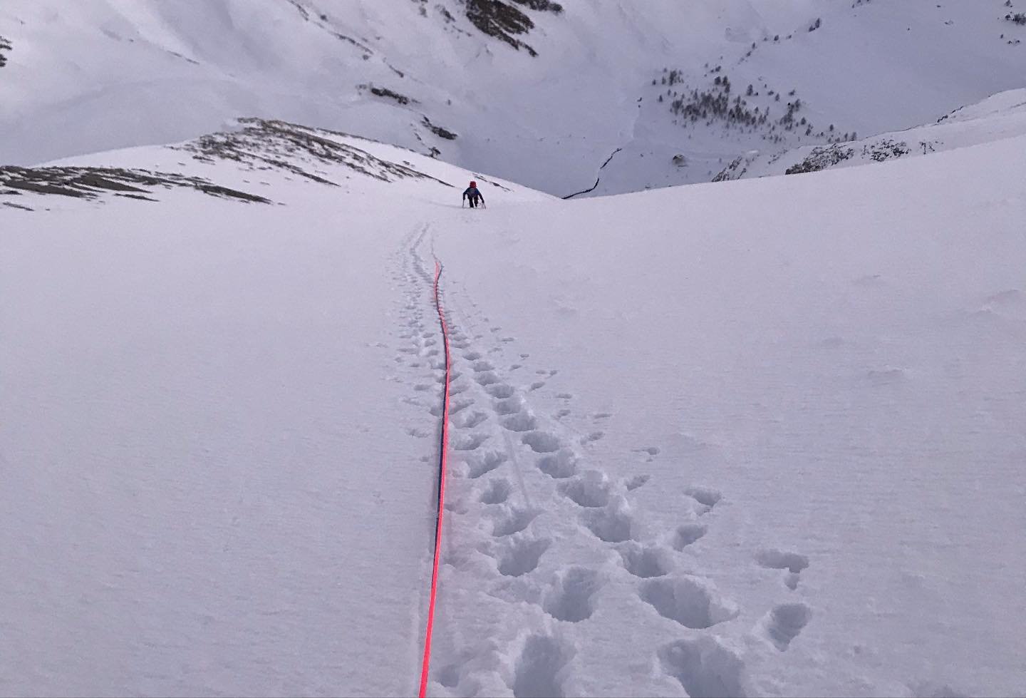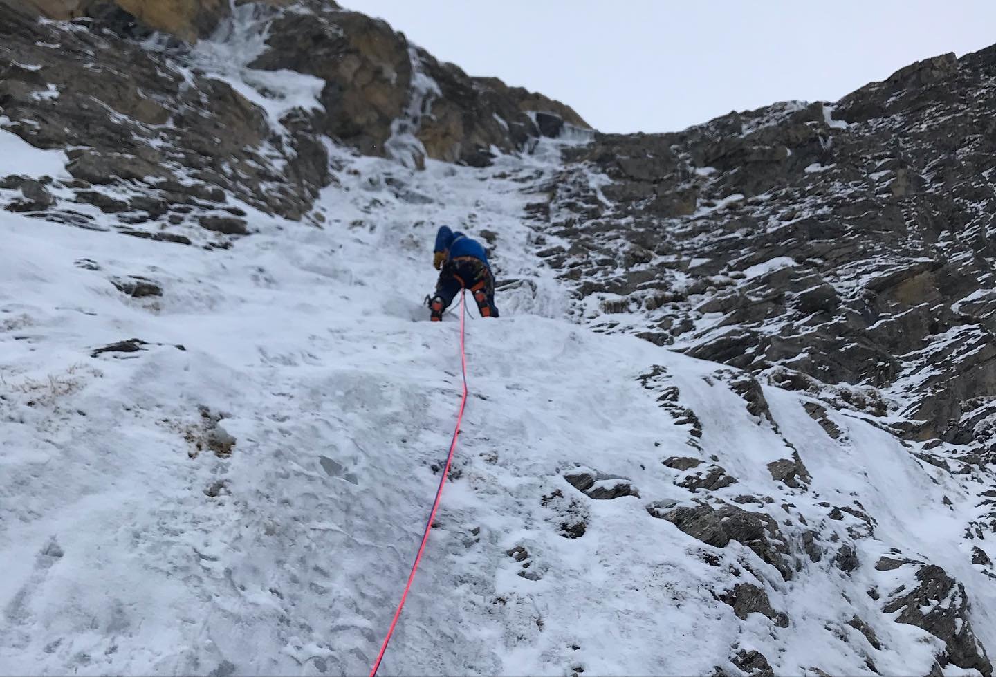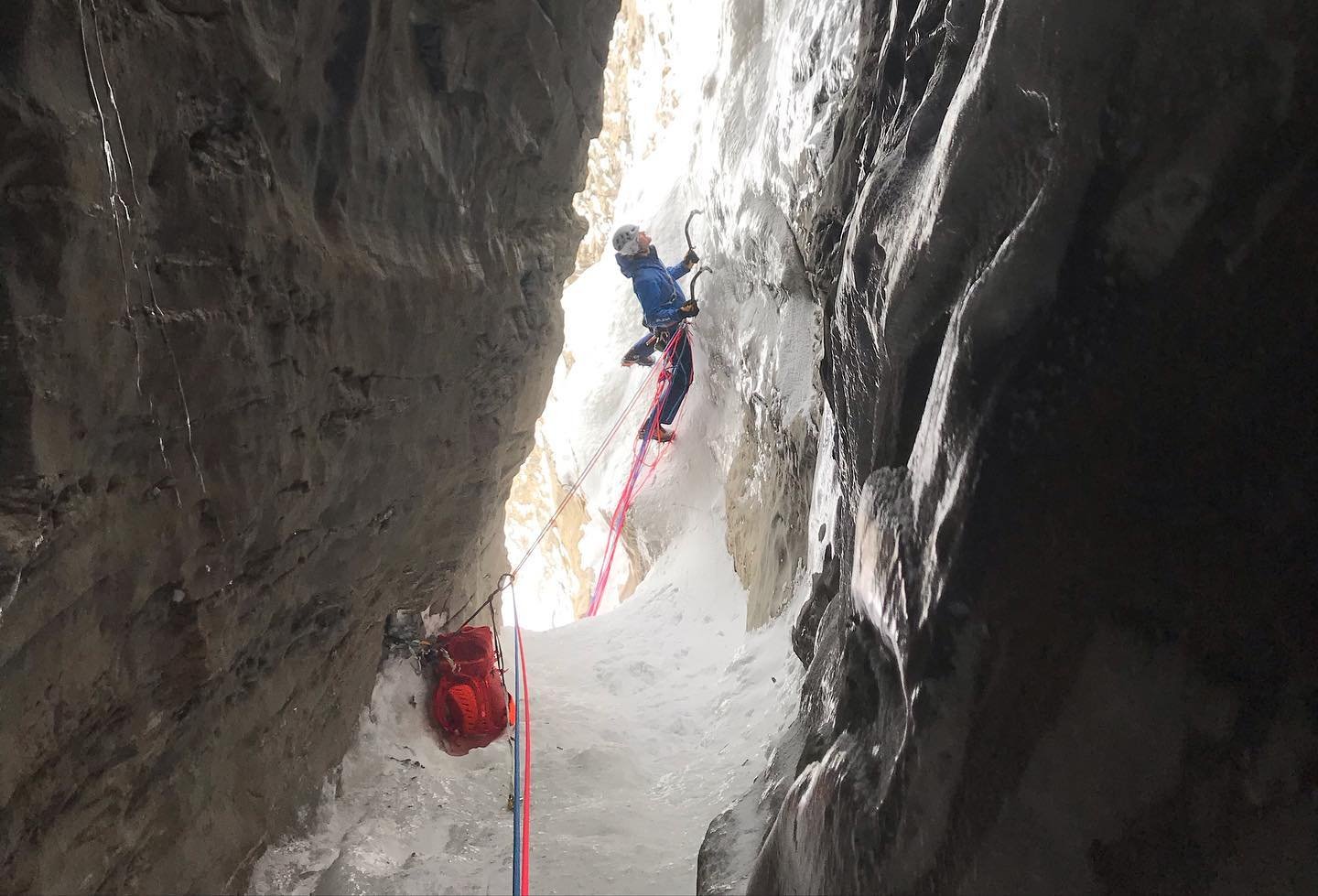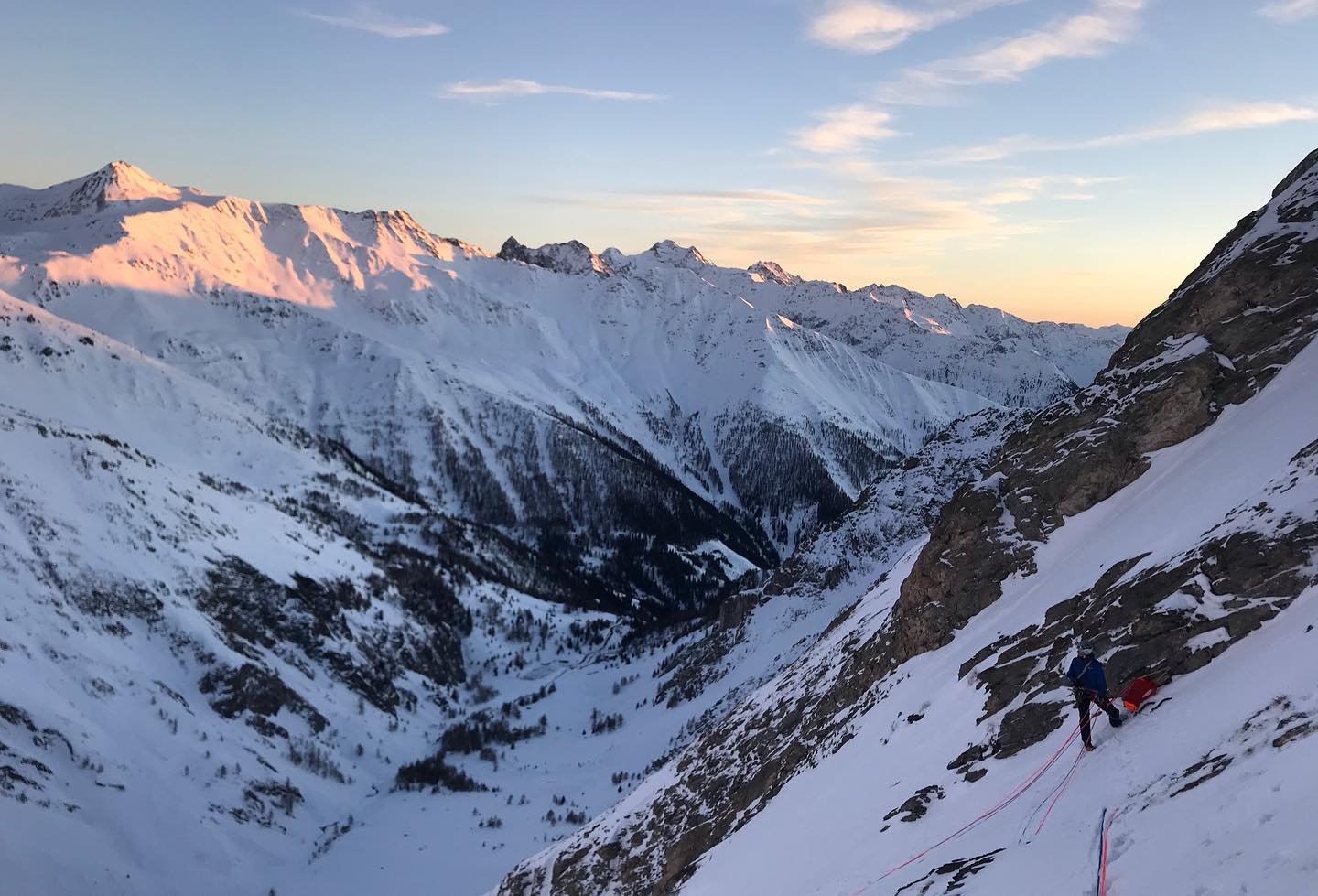 Über die Route an vorhandenen Ständen (Schlaghaken) und Eisuhren abseilen und absteigen.