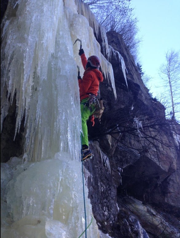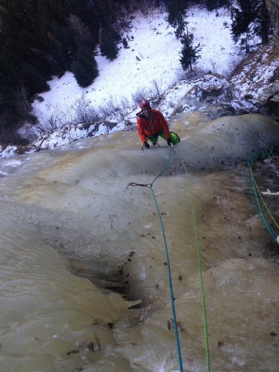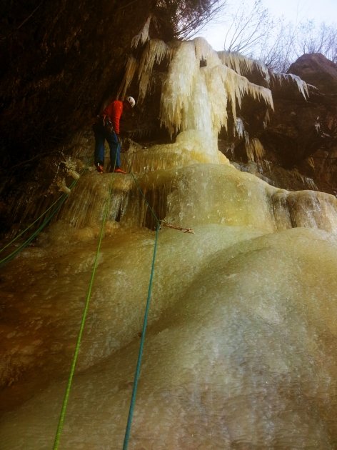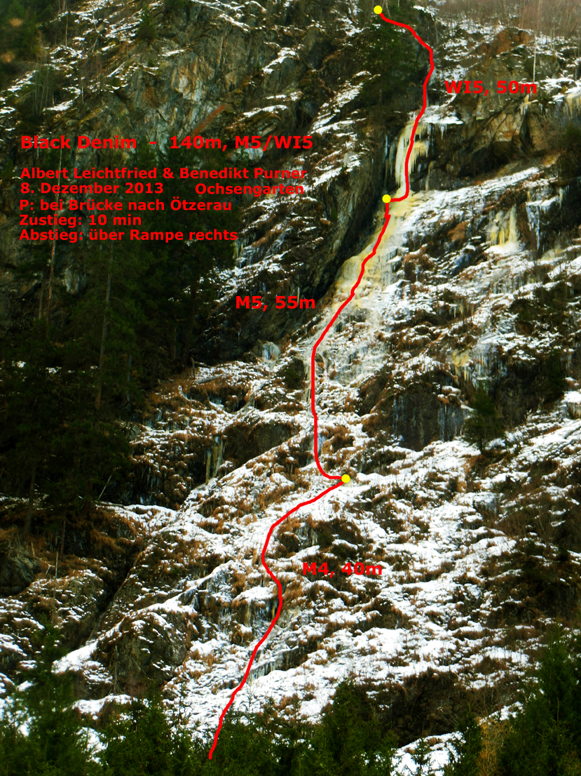 Neue Mixedtour im Ochsengarten, die Linie hat nicht immer Eis. Unten Mixedgelände, auch mit Graspolstern, in der Mitte dann schwerer und oben mit einem Ausstieg an gelbem Eis.