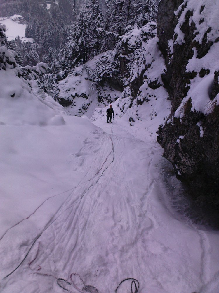 Über den Fall abseilen oder beim Ausstieg nach links queren und über Forstweg absteigen.
