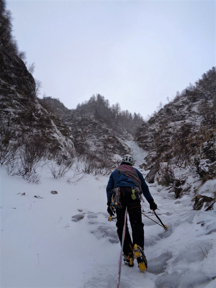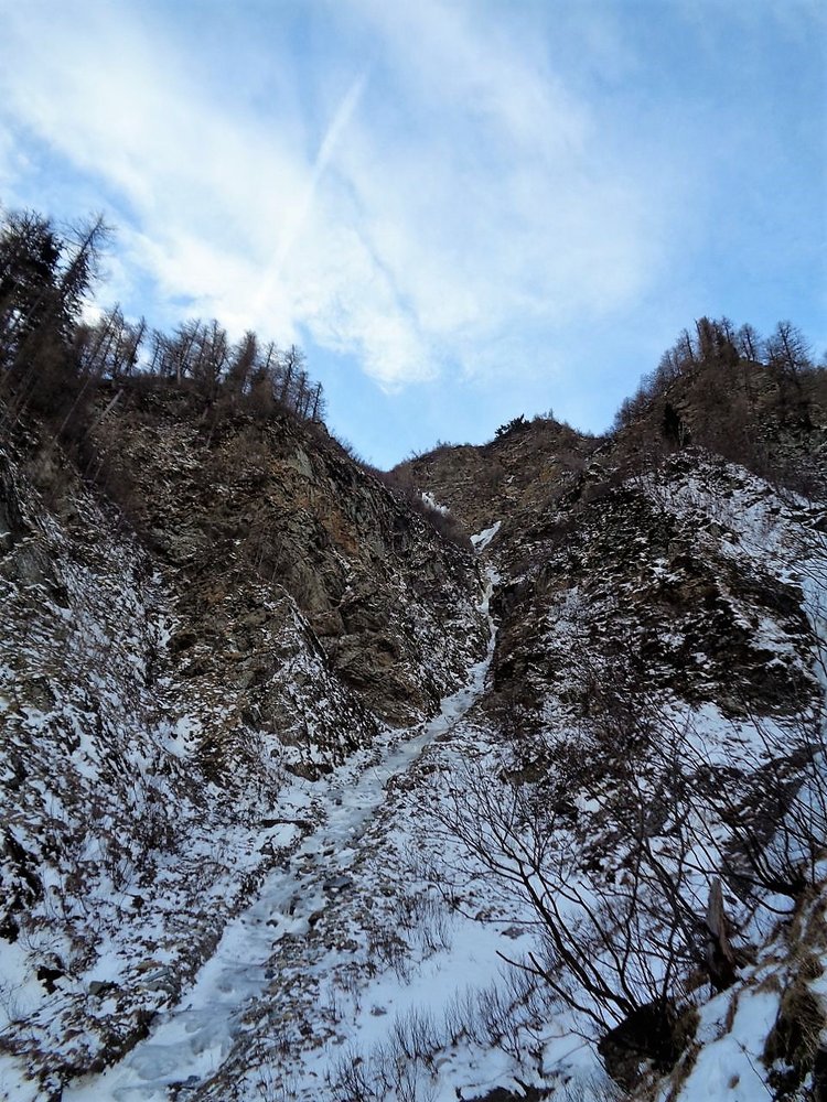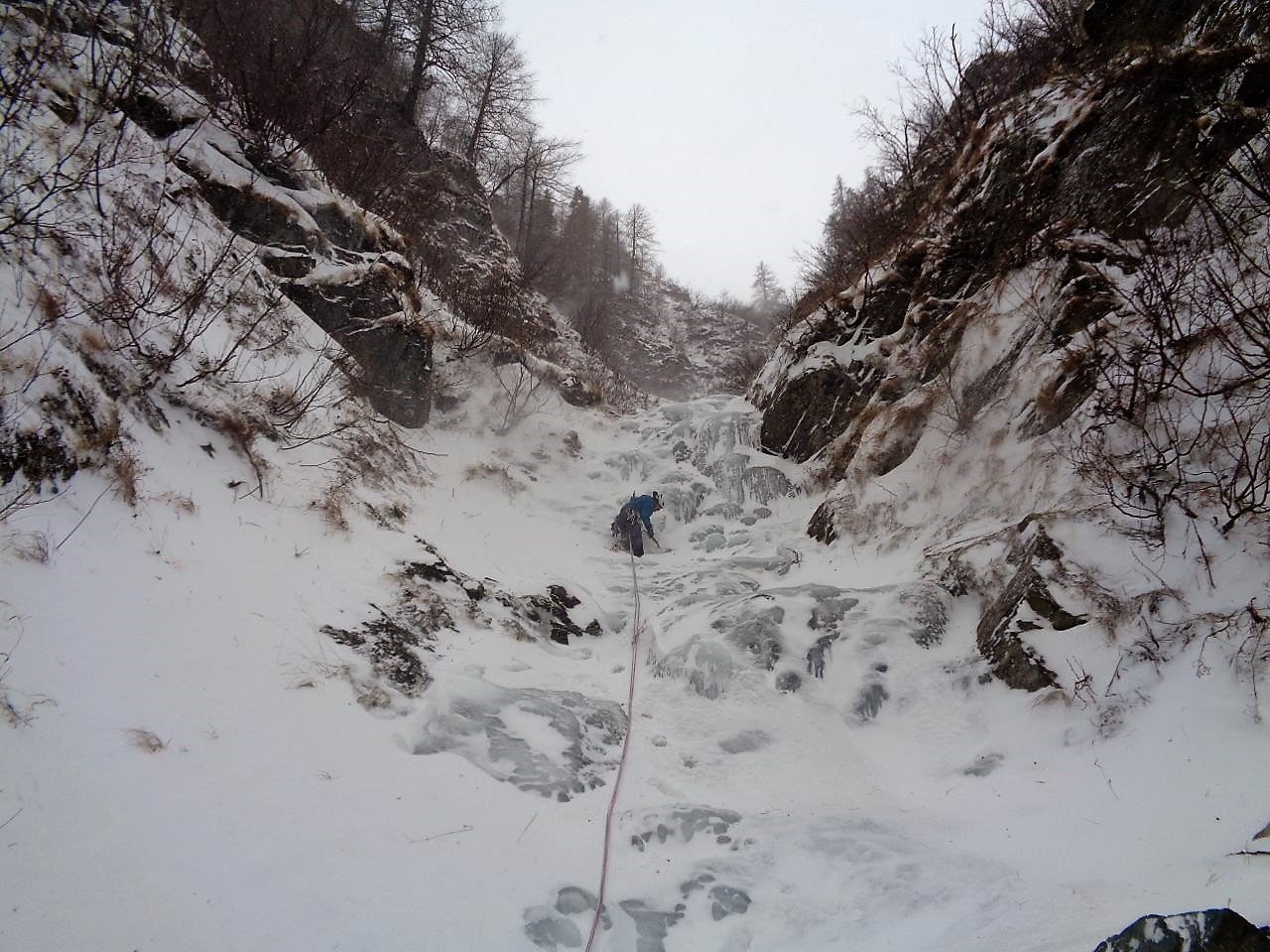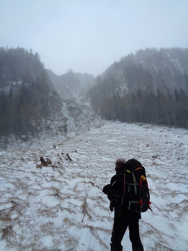 Vom Parkplatz nach Süden, über die Brücke, bis man auf eine Lichtung gelangt (ca. 450m). Dann für weitere 500 Meter in westlicher Richtung auf einem Forstweg, bis man den Wasserfall bereits einsieht. Nun in südwestlicher Richtung über die Wiese hoch zum Einstieg des Wasserfalls. Hier Depot machen.