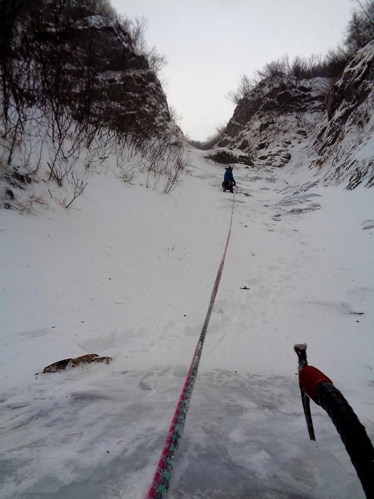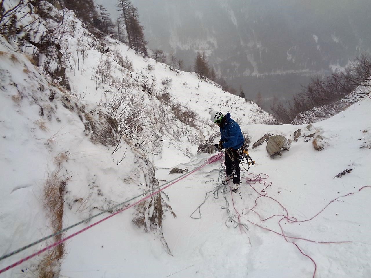 Über den Wasserfall abseilen bzw. absteigen. Siehe Topo!