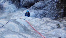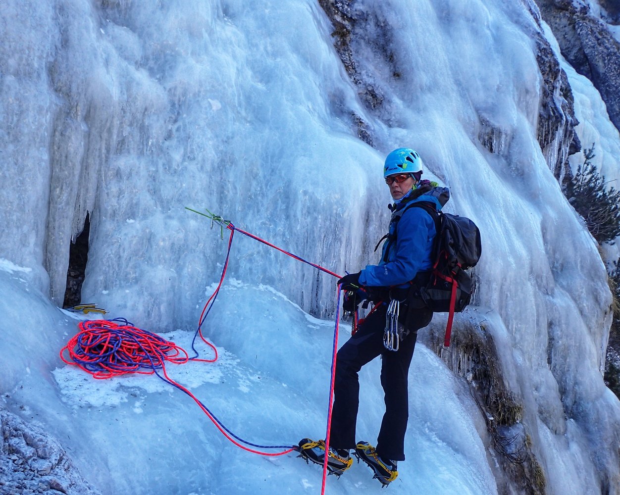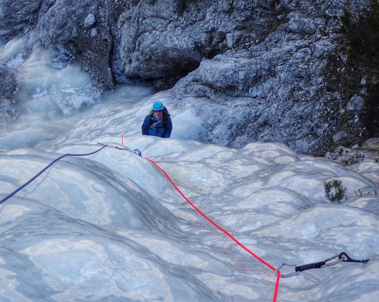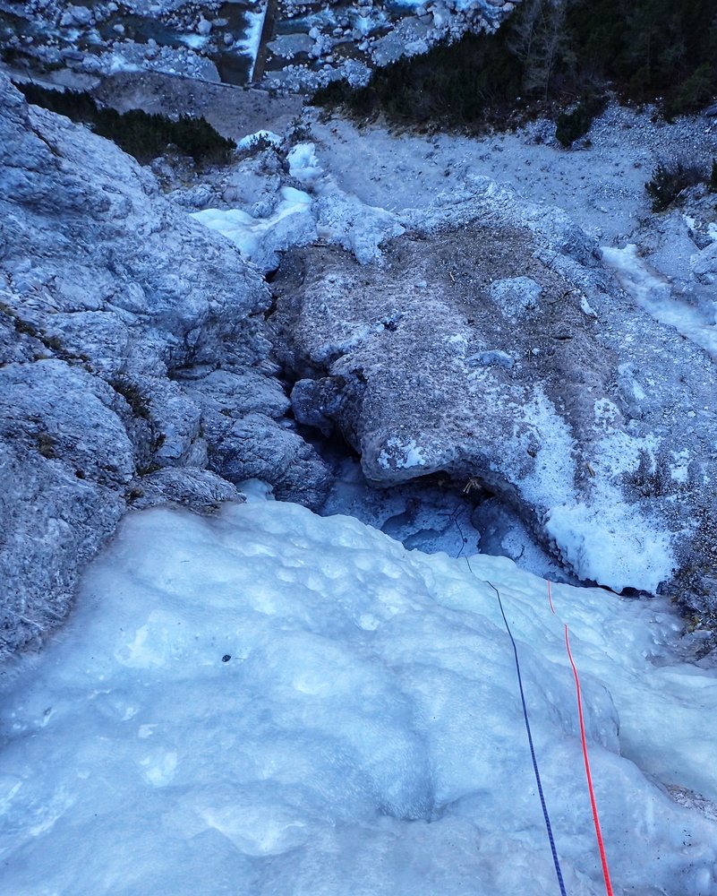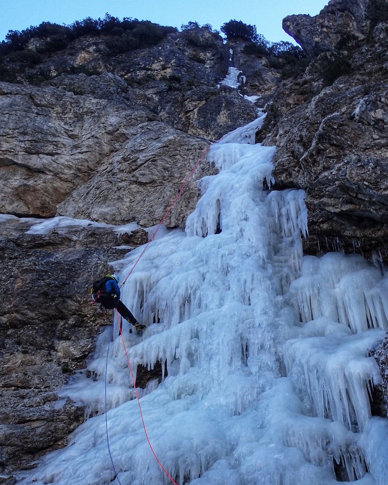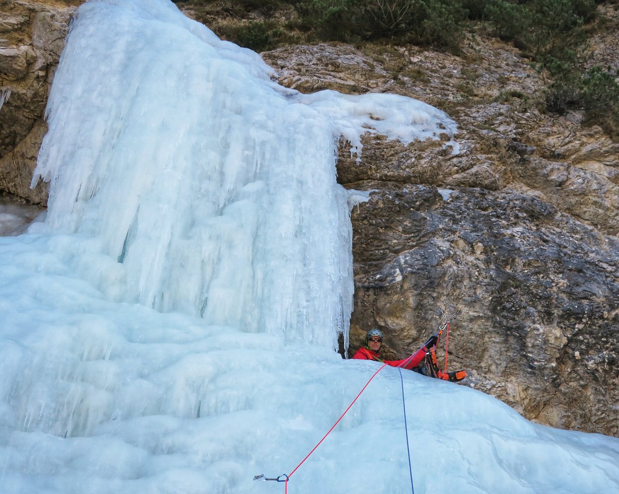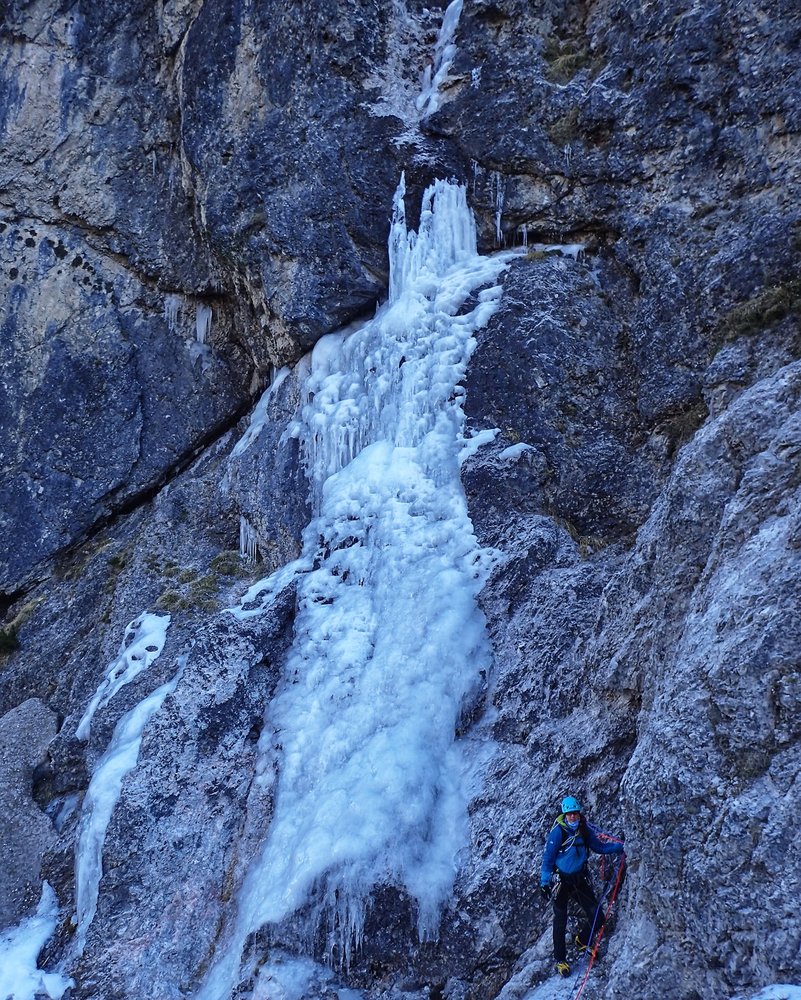 Zwei Wasserfälle. Nach drei Seillängen ist ein Umstieg möglich.