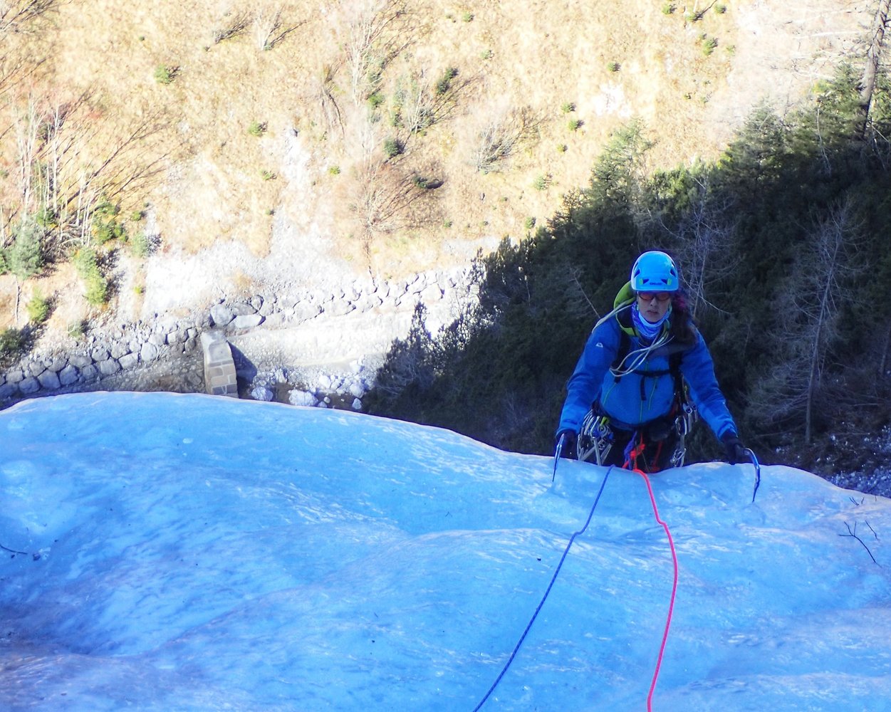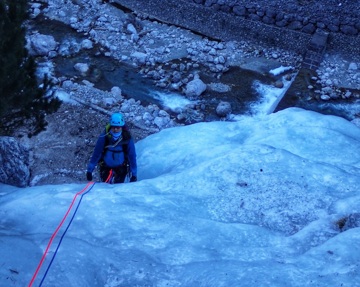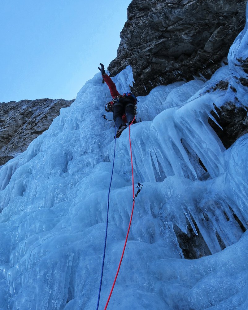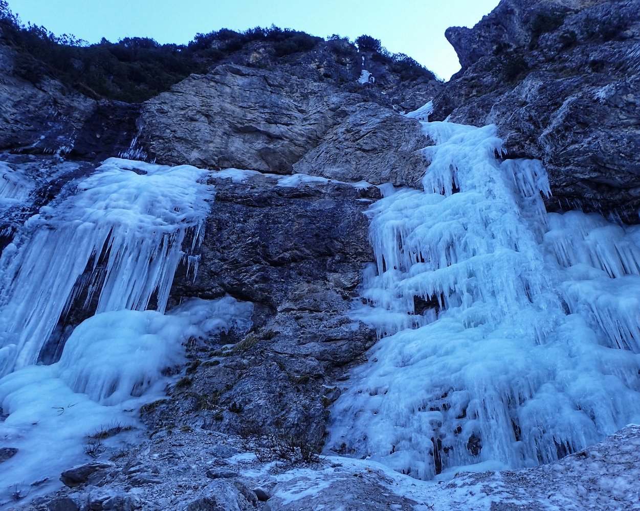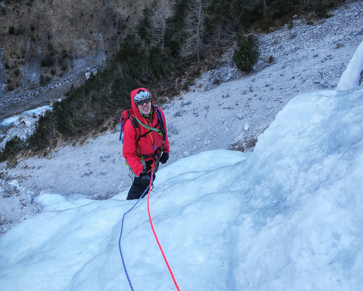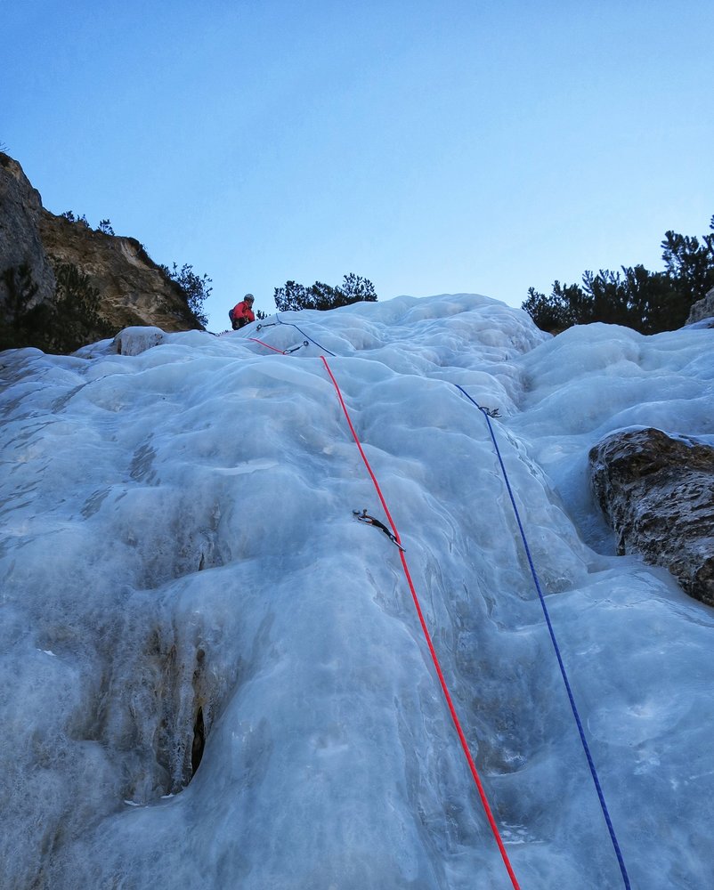 Zwei Wasserfälle. Nach drei Seillängen ist ein Umstieg möglich.