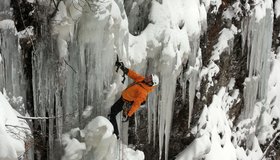 Abwechslungsreiche Kletterei in Überhängendem Eis. Künstlich erschaffener Eiskletterlinie rechts neben dem Bekannten "Hauptfall" hinter dem Naturfreunde Haus Kolm Saigurn.