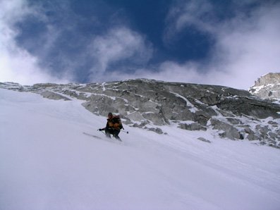 Einstieg in Falllinie des rechten Randes der Felsinsel, dort an geeigneter Stelle über den Bergschrund (50°, evtl. auch deutlich steiler). Nach dessen Überwindung im 45° steilen Gelände bis zum rechten oberen Rand der Felsinsel. Von dort mit einer ansteigenden Linksquerung bis zum NO-Grat und weiter zum Gipfel. Bei idealen Verhältnissen kann auch im kombinierten Gelände direkt zum Gipfel aufgestiegen werden.