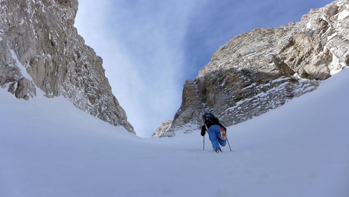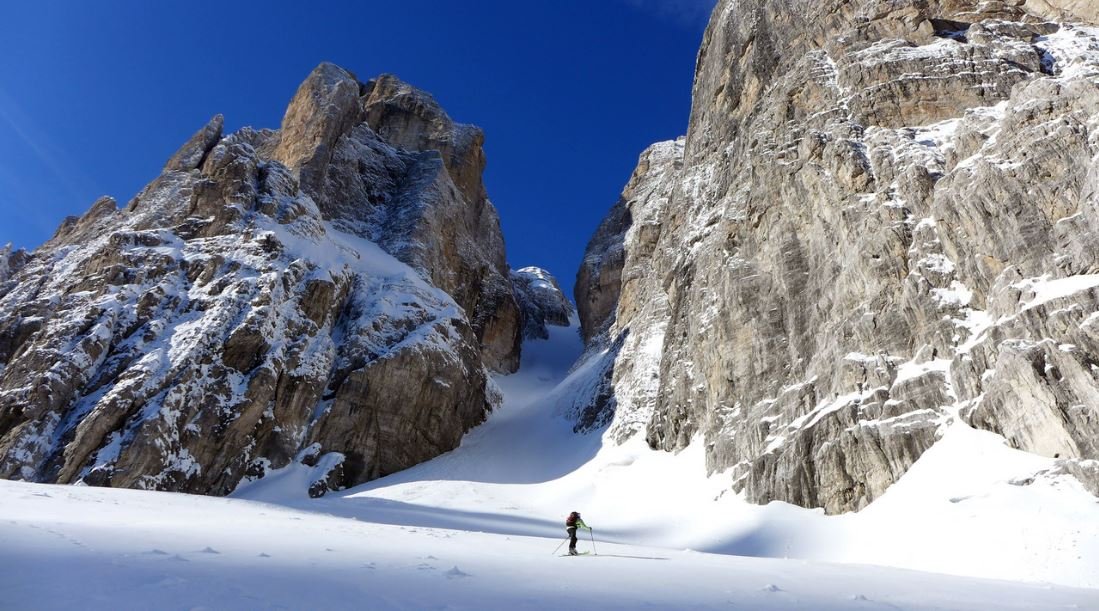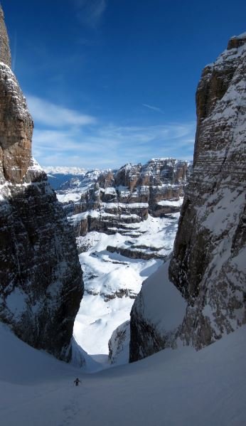 Dieser absolute Klassiker führt durch eine Eisrinne, die von bis zu 700 m hohen Felswänden umrahmt wird, auf den höchsten Gipfel der Brentagruppe. Obwohl die Neigung 50° kaum überschreitet, sollte die Tour wegen der Wandhöhe von 800 m und des nicht allzu leichten Abstieges nicht unterschätzt werden.