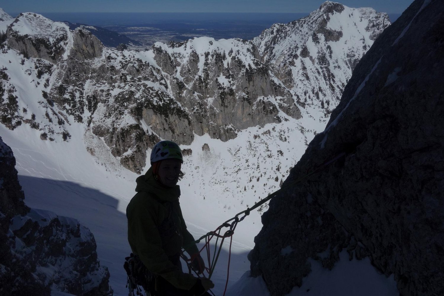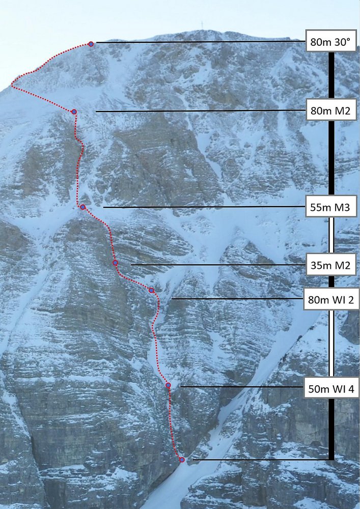 Abwechslungsreicher Mixed- und Eisspaziergang entlang einer logischen Linie durch die breite N-Flanke der Großen Schlicke. Landschaftlich wunderschön ist allein schon der Zustieg auf den kalkkögelähnlich gebänderten Wandsockel zu und der Blick aus der Wand auf das Alpenvorland. Auch die Abfahrt als auch schon eigenständige Skitour ist nicht zu verachten.
