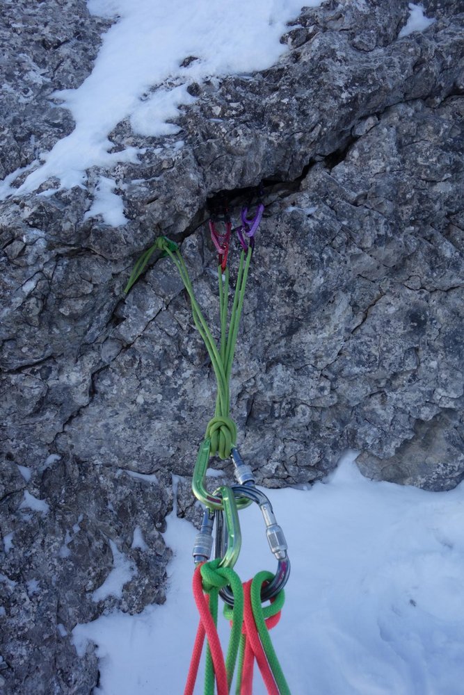 Kleines Set Messer- und Fiechtl-Haken, 3 kurze Eisschrauben. Bis auf einen grünen Salewa Fiechtl-Haken am ersten Standplatz kein fixes Material vorhanden.