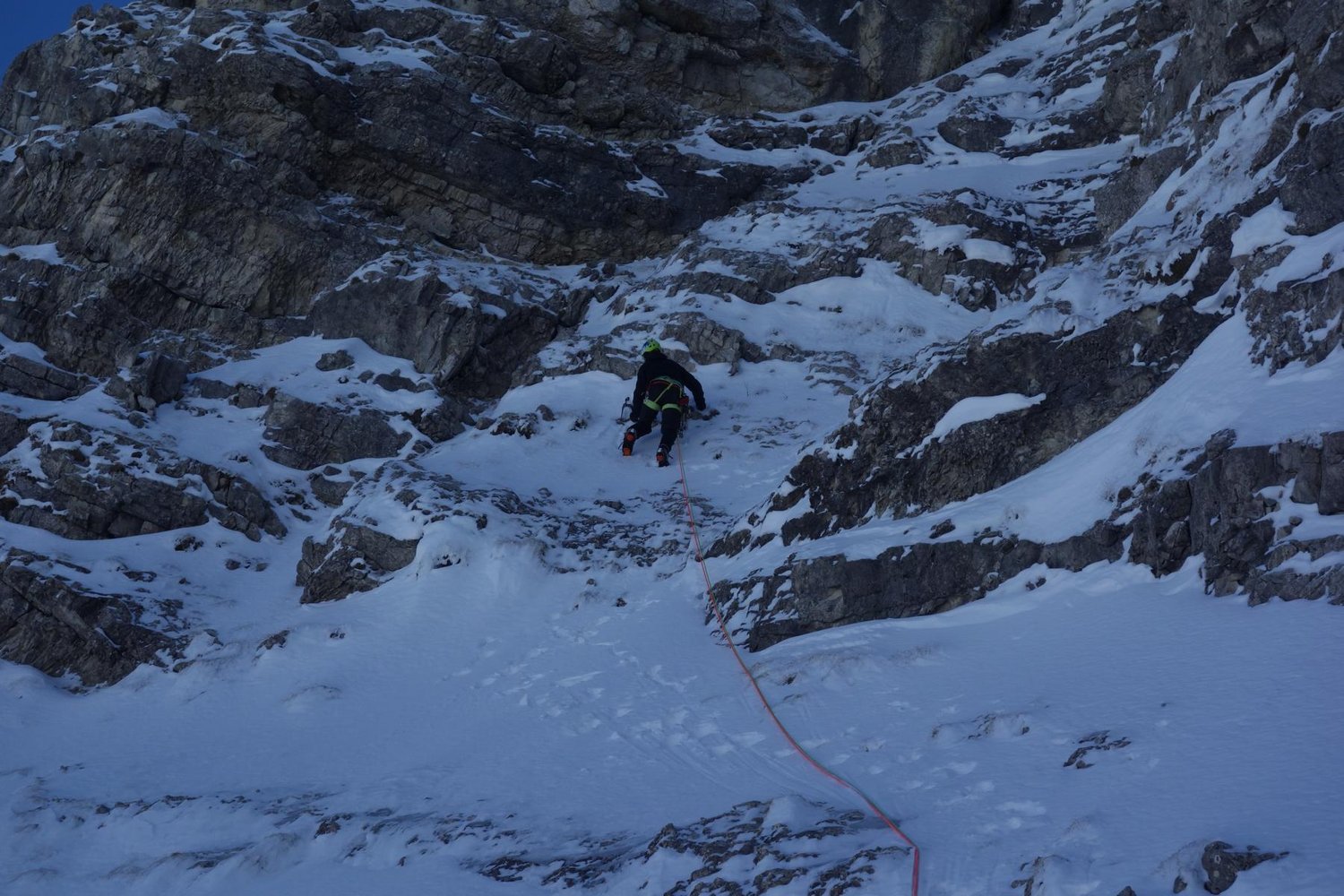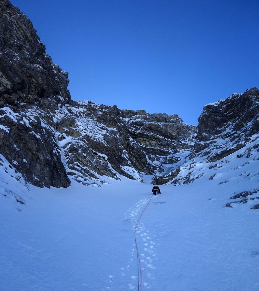 5. SL: Ab hier seilfrei über leichtes Gelände zur Fortsetzung des Couloirs und dieses über ein paar kurze Aufschwünge hinauf zum großen Schneeband kurz unter dem Gipfel. Ca. 80m, M2 (seilfrei).