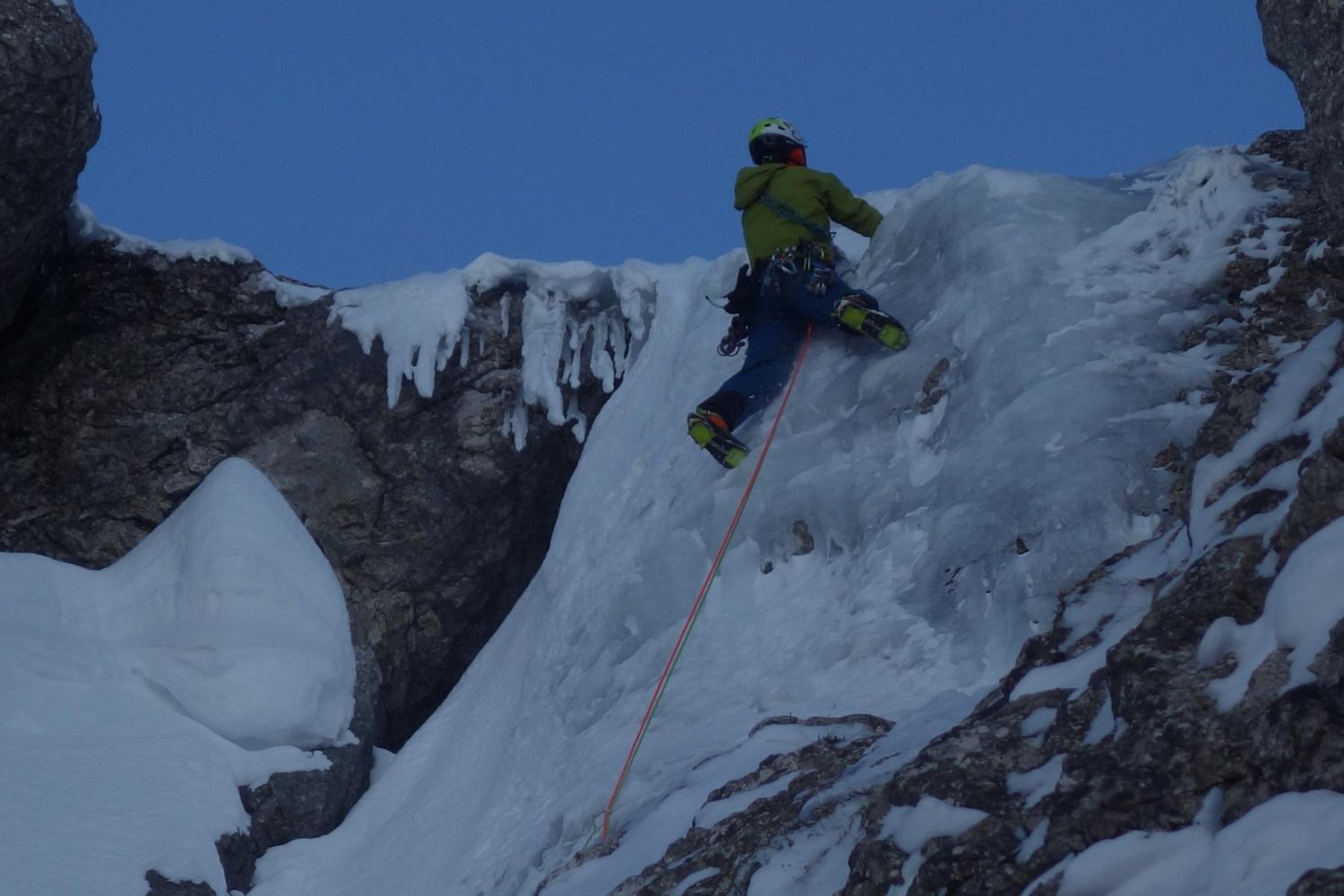 1. SL: Das Couloir zunehmend steiler hinauf und über die abschließende Steilstufe zum Ende des Eisfalls. Stand am linken Rand des Couloirs an C4 #1, #0.5 und 1 grüner Salewa Fiechtl-Haken (belassen). 50m, WI 4, 2-3 Schrauben