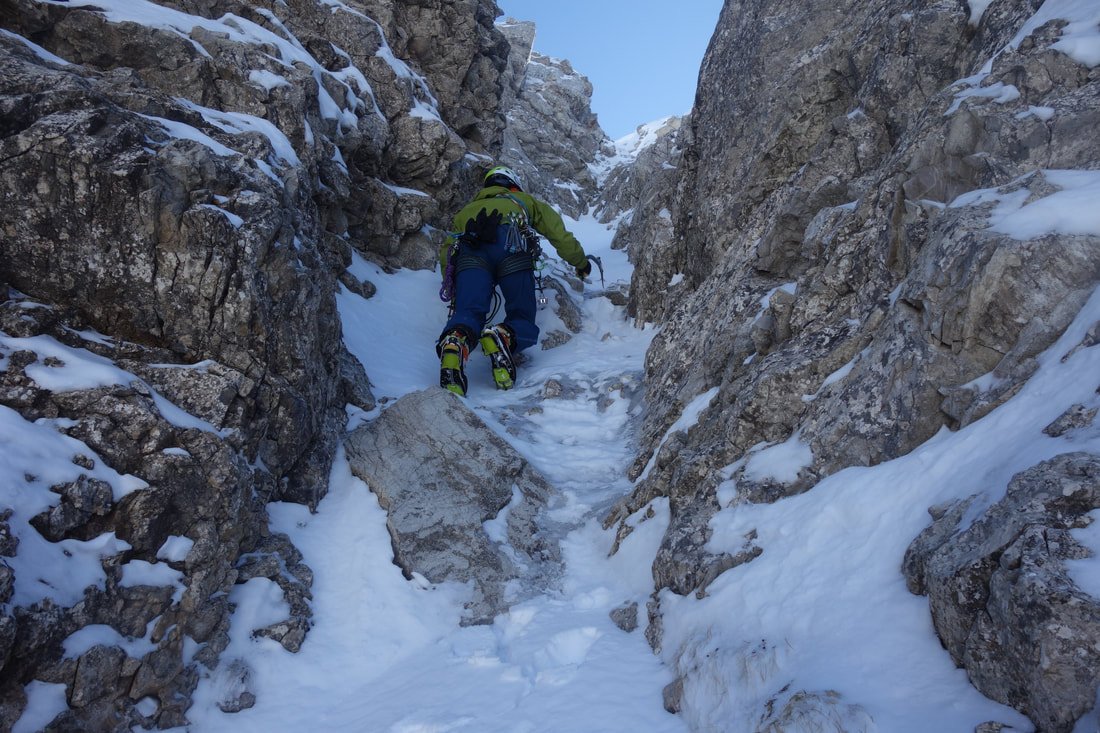 4. SL: Über die Eisstufe und das folgende Couloir hinauf auf Absatz. Stand an Eisgerät und Rock 4. 55m, M3, Schraube, C4 #2