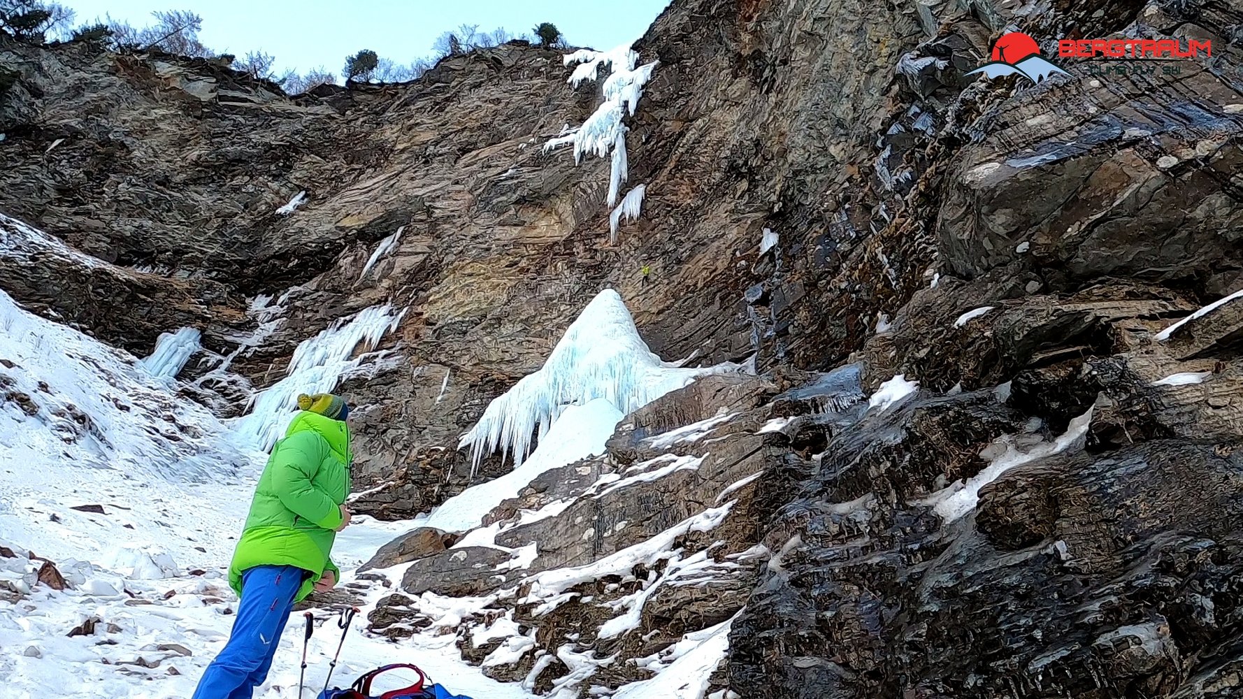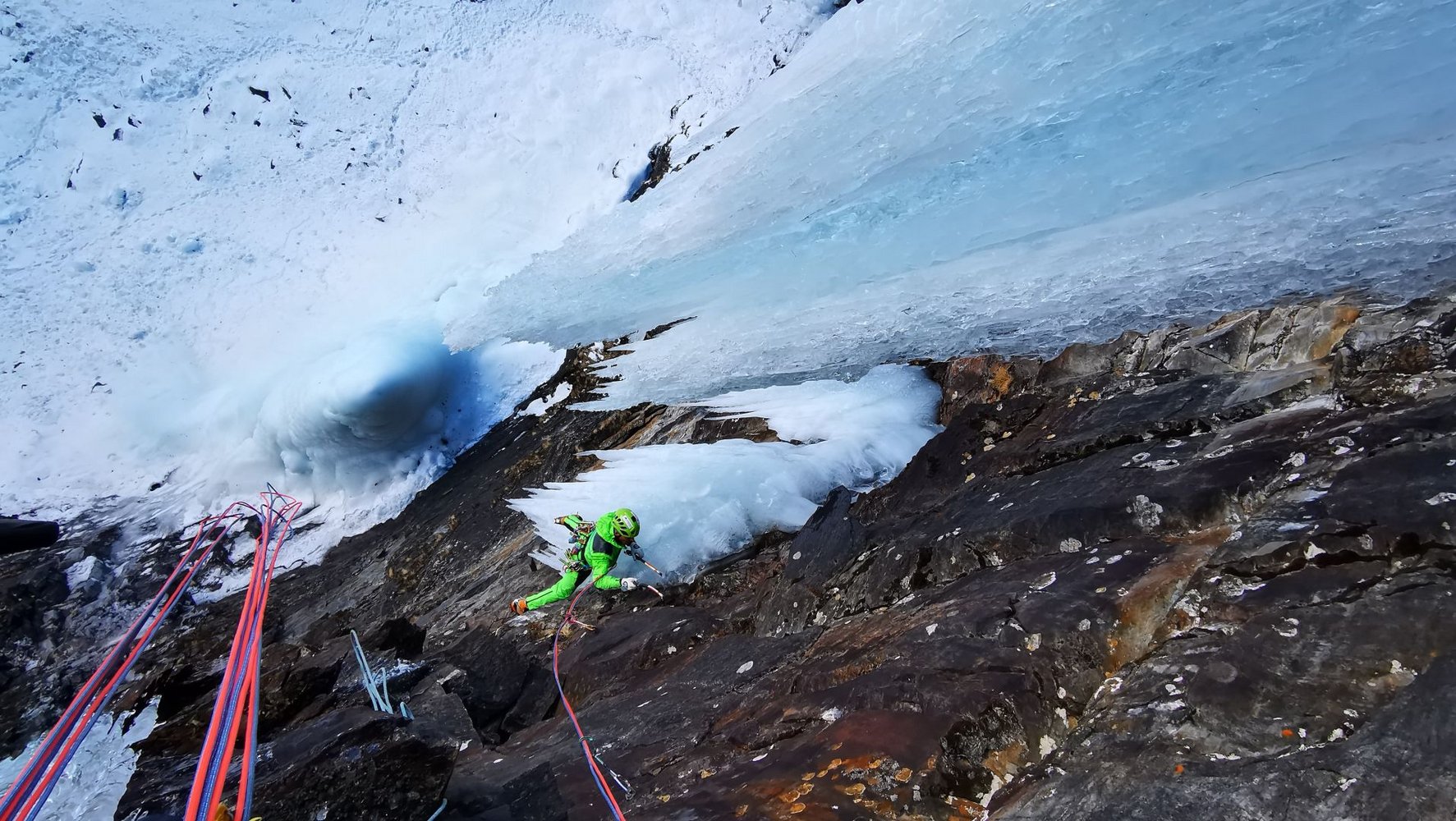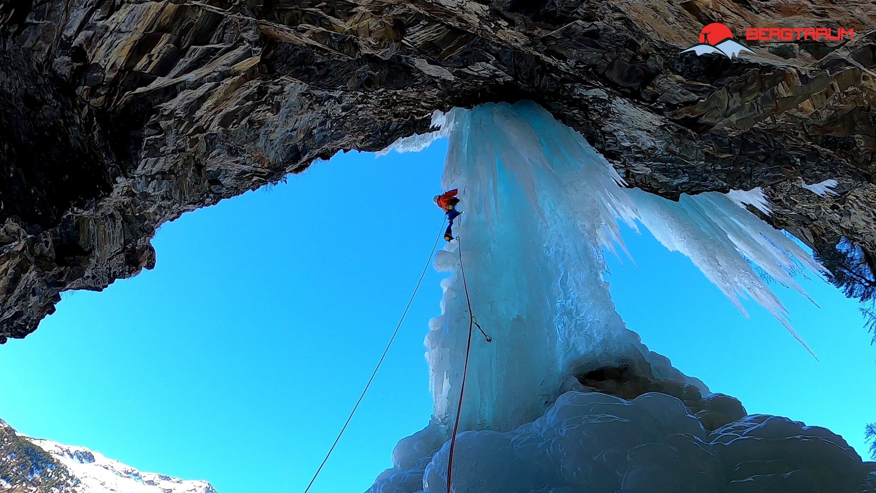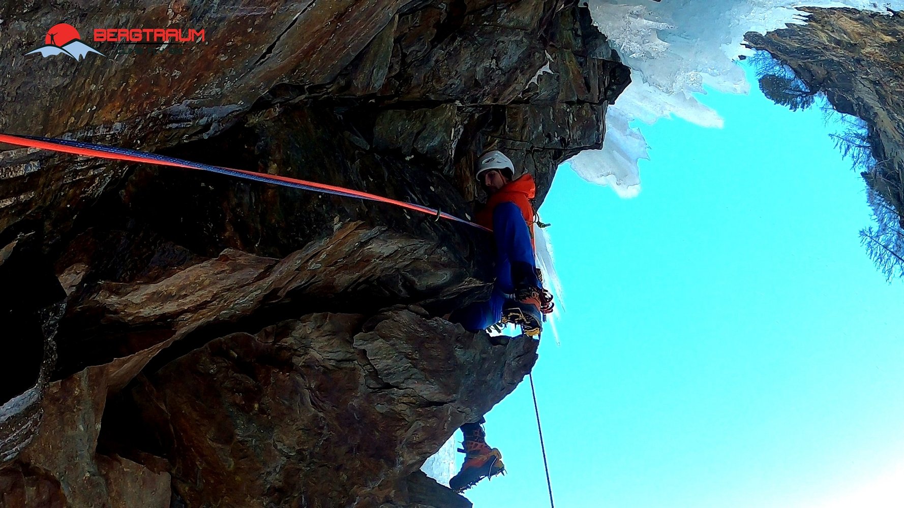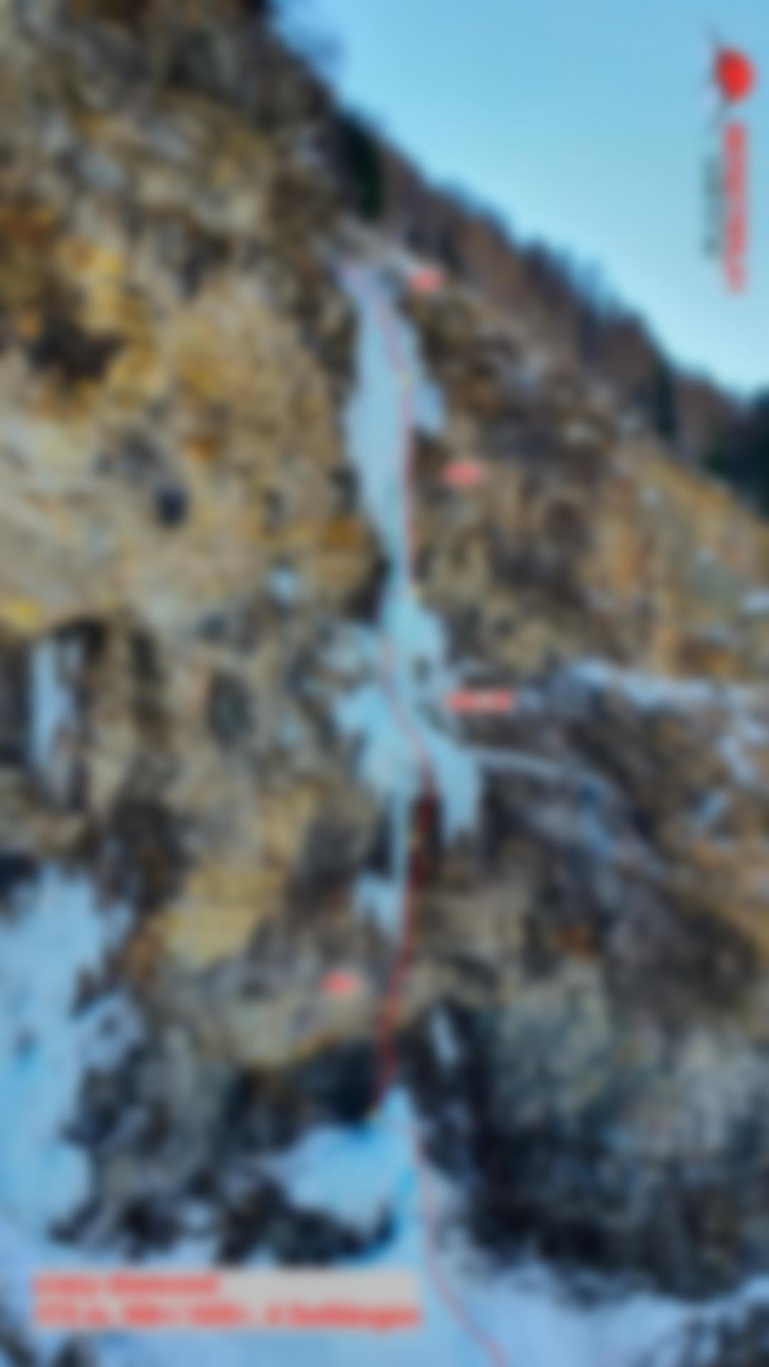 Eisfall trotz der nordseitigen Ausrichtung fast immer sehr nass. Darüber Lawineneinzugsgebiet! Die Felslänge unten ist gut mit bolts abgesichert, aber anhaltend steil und pumpig (gefühlt um einen Schwierigkeitsgrat schwerer als die Zauberflöte). Die freistehende Eissäule oben kritisch betrachten.