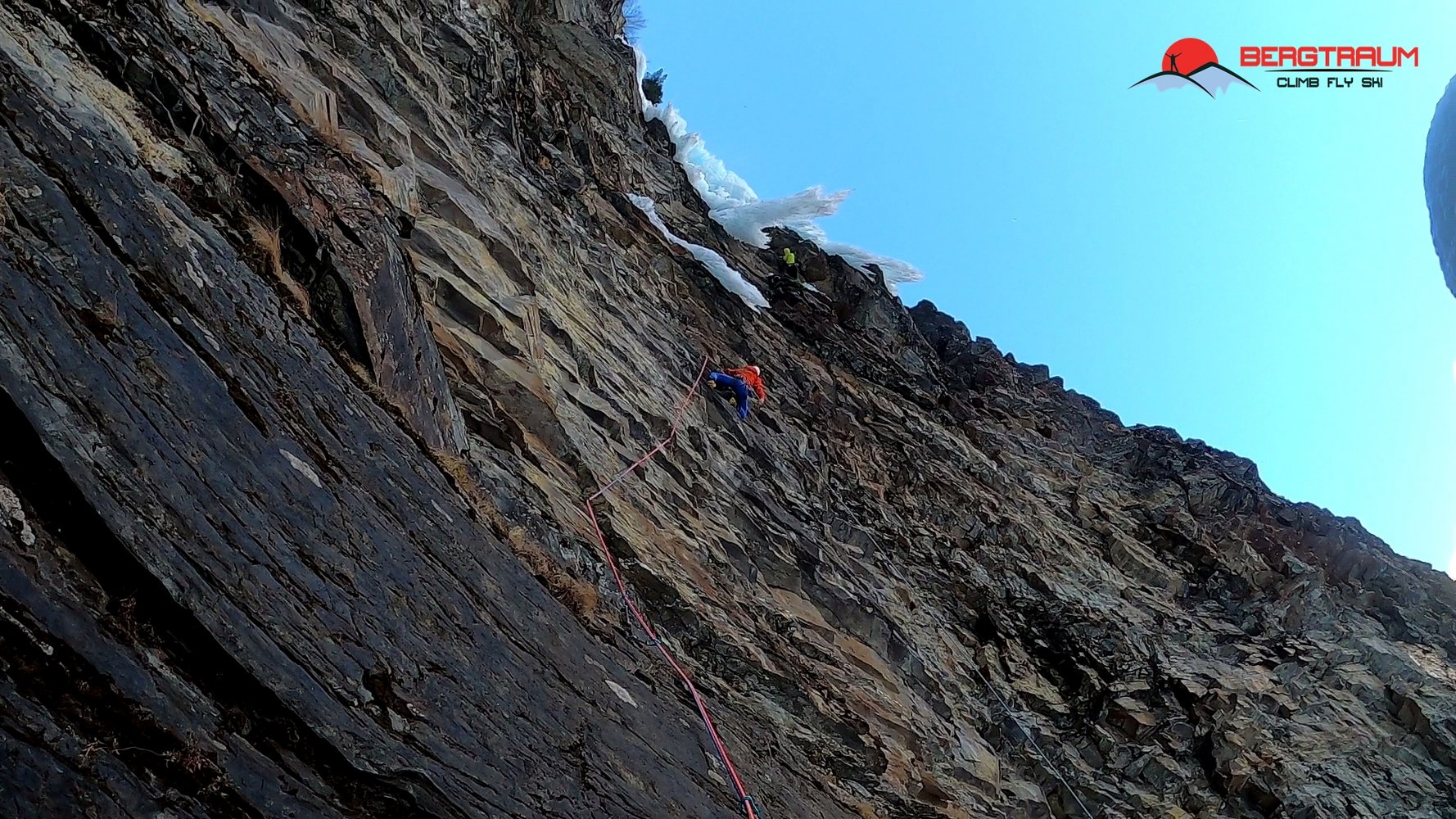 Gesamt 4 SL: L1: M8+, 45 m. L2: WI 5+/M7, 40 m. L3: WI 5+, 40 m. L4: WI 2, 50 m