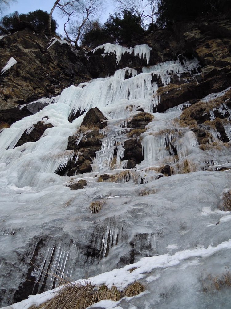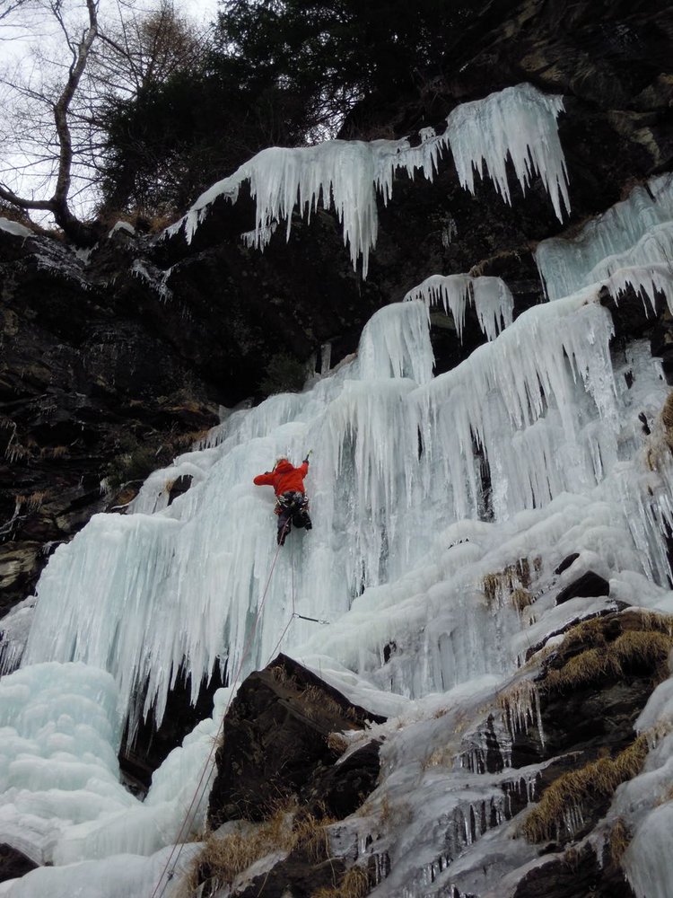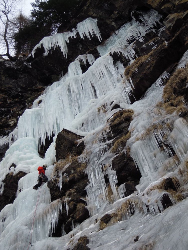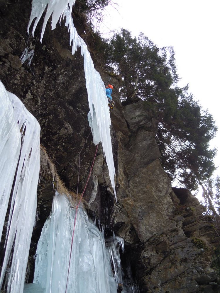 Über die Brücke und durch den Wald aufsteigen. Es empfiehlt sich, bereits weiter unten das Depot zu machen und über leichtes Eis ca. 100m (WI3) zum eigentlichen Fall aufzusteigen.