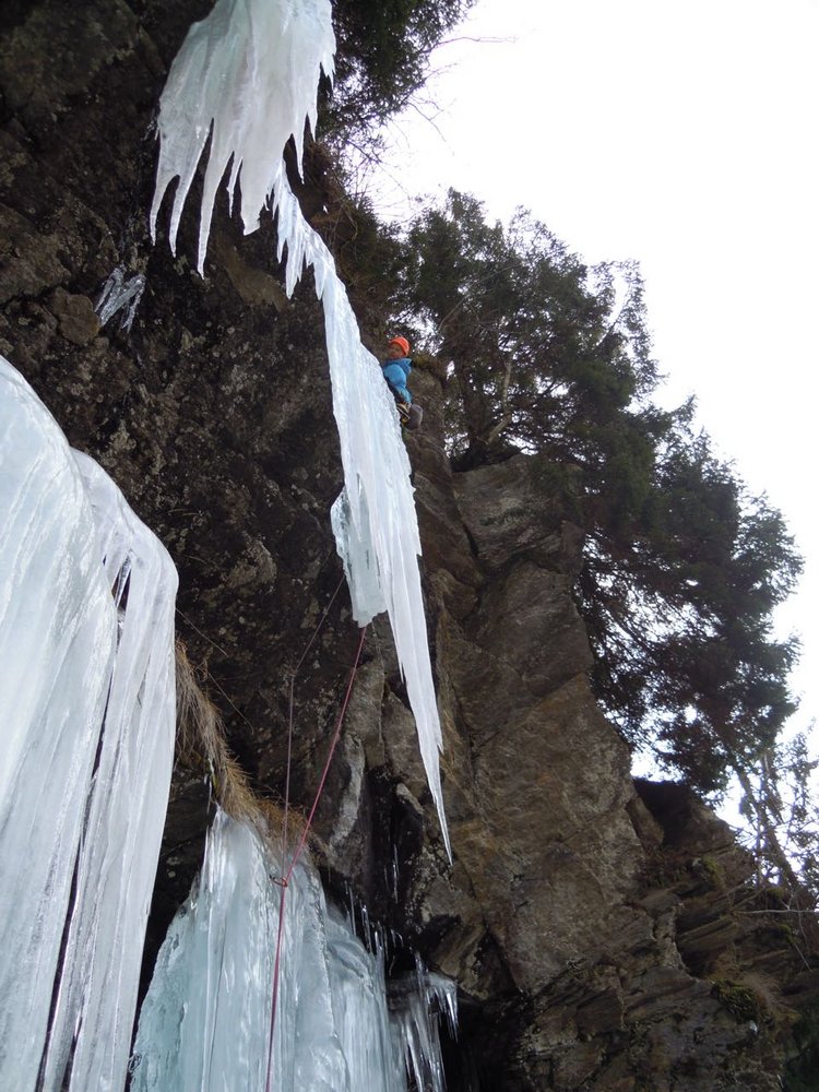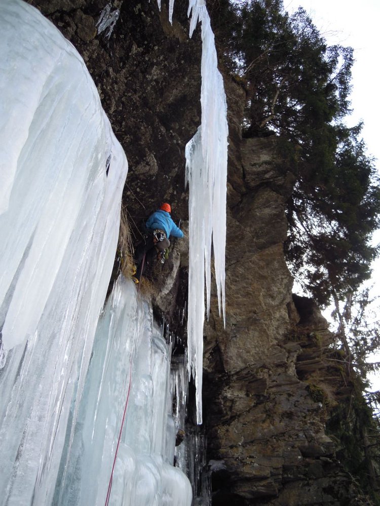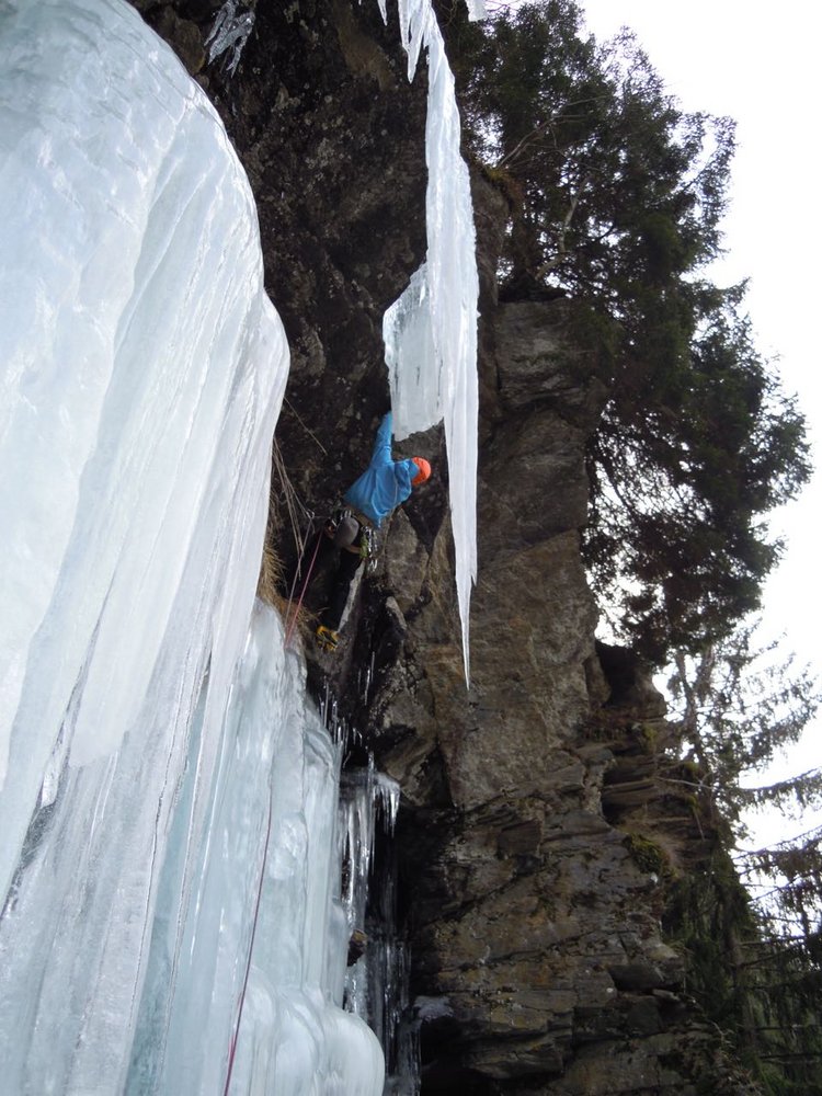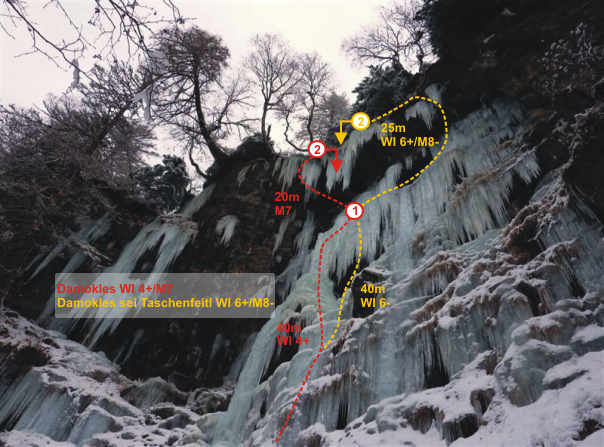 Die Touren im Kaltenbrunnerwald bei Winklern haben sich in den letzten Jahren zu einem Hotspot für starke Eis- und Mixedkletterer entwickelt. Die hier beschriebene Neutour rechts des Damokles ist ein absolutes Highlight und sollte mit seiner E4/E5 - Bewertung nicht unterschätzt werden. Die kurze und knackige Linie, mit einem Mixed-Ausstieg auf freihängenden Zapfen bestückt, ist nur Topalpinisten mit emotional gefestigter Psyche anzuraten. Der Ausstieg wurde mit 2 Schlaghaken, zweifelhafter Qualität und einem Köpfel, gesichert. Auch ein sehr guter Kletterer könnte hier zweifellos Gründe finden, wieder umzukehren.