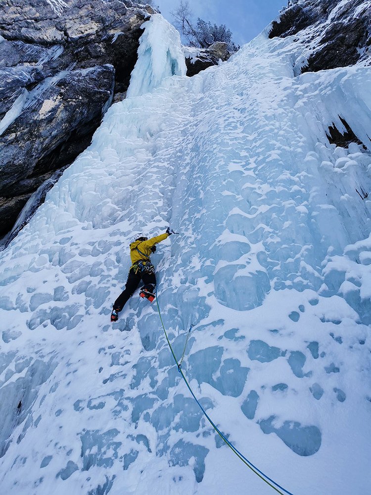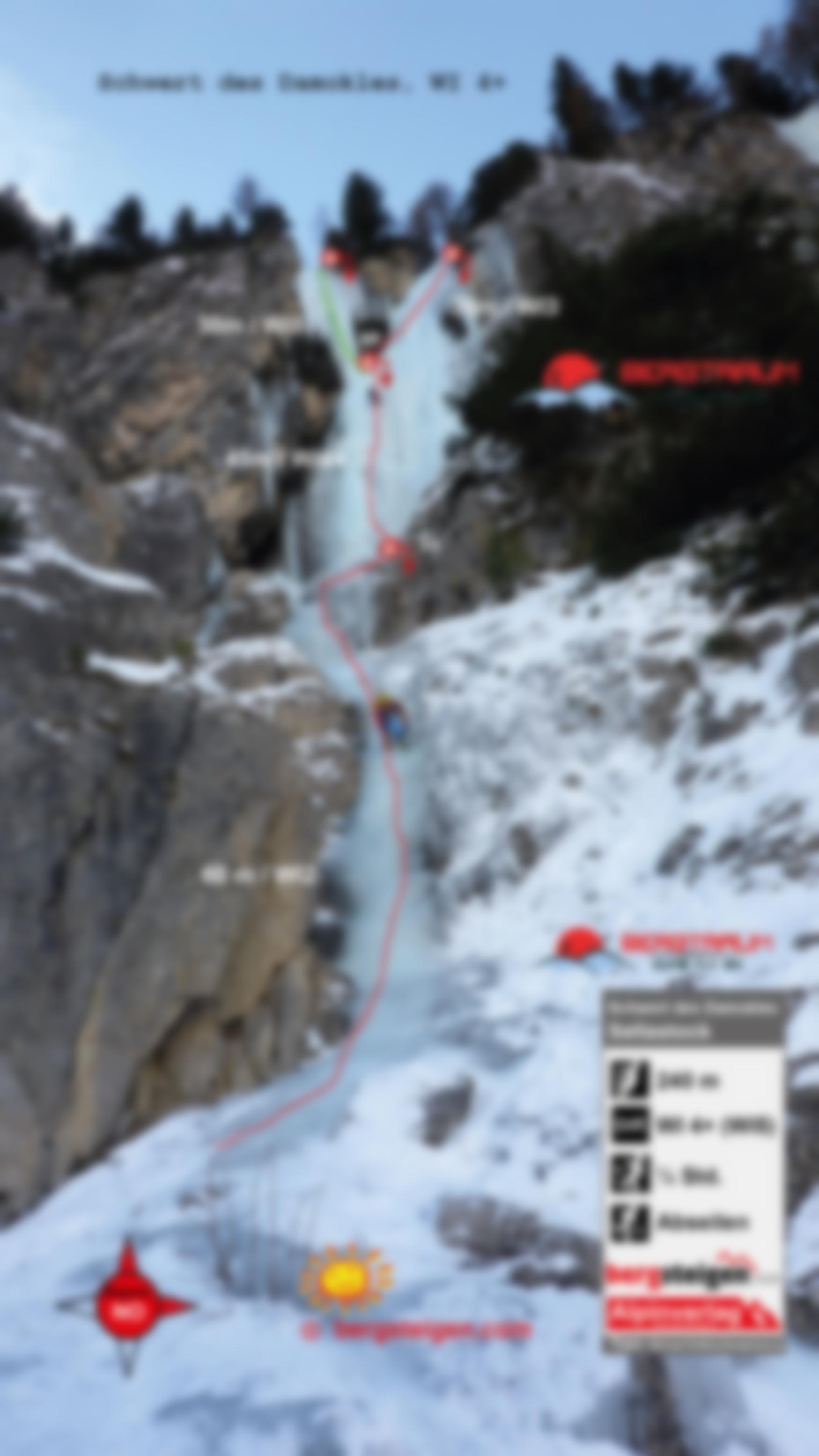 Vom Einstieg über leichtes, gestuftes Gelände zu Stand. Die zweite Länge ist anhaltend steil und führt in eine perfekte Nische hinter einer Eissäule. Die dritte Länge führt gemäßigt zum Stand bei Baum.