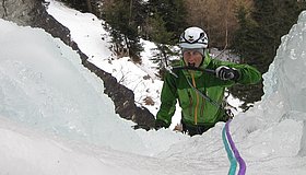 Die erste länge führt durch Kompacktes Eis bis zu einem kleinen Eisüberhang mit Gleschereis änlichen Formationen. Über diesen hinweg zum sehr guten Stand unter dem Felsdach. Zweite Seillänge über eine Röhreneissäule (nass) zum Ausstieg des Eispilzes.