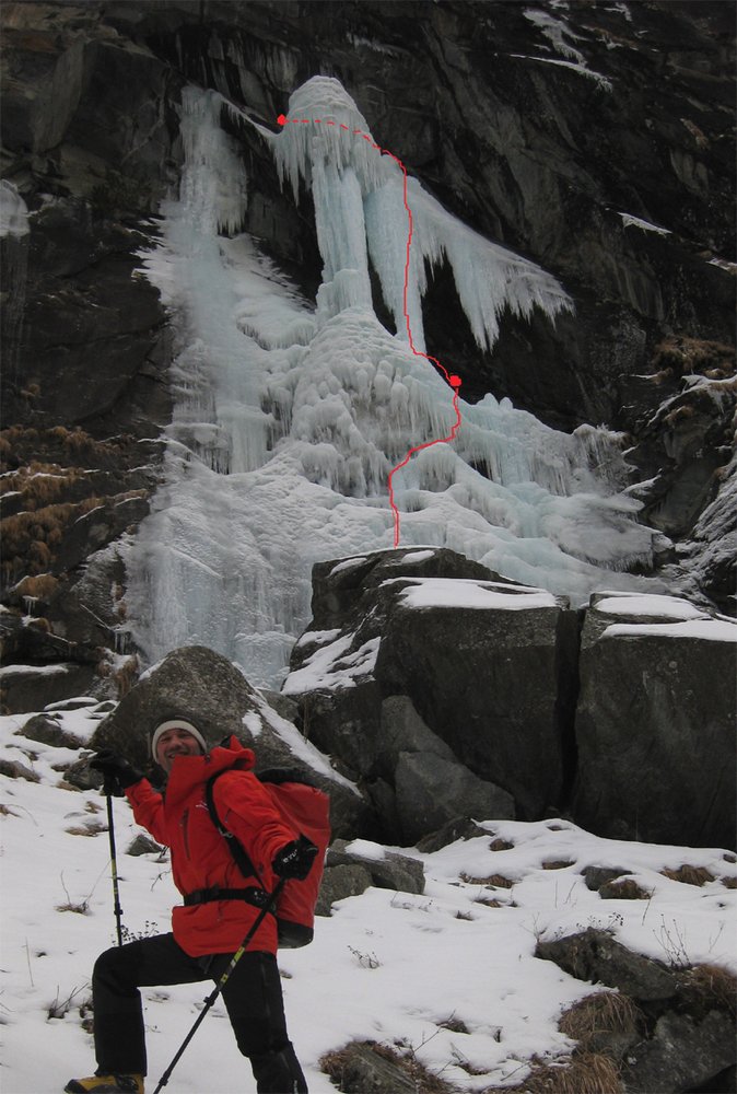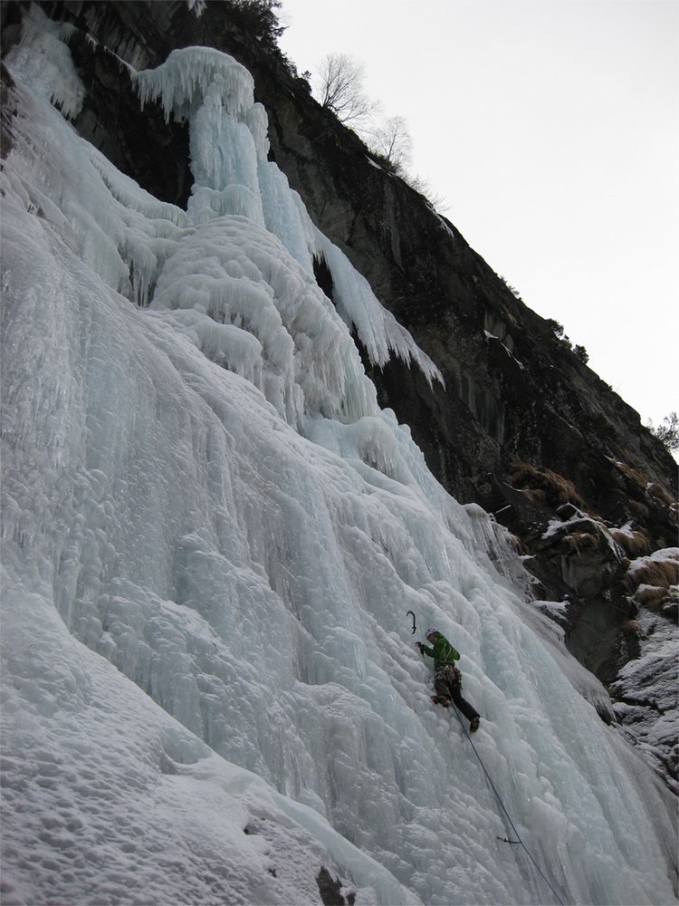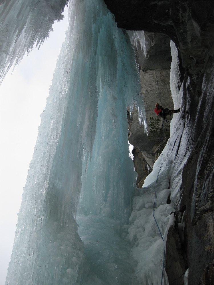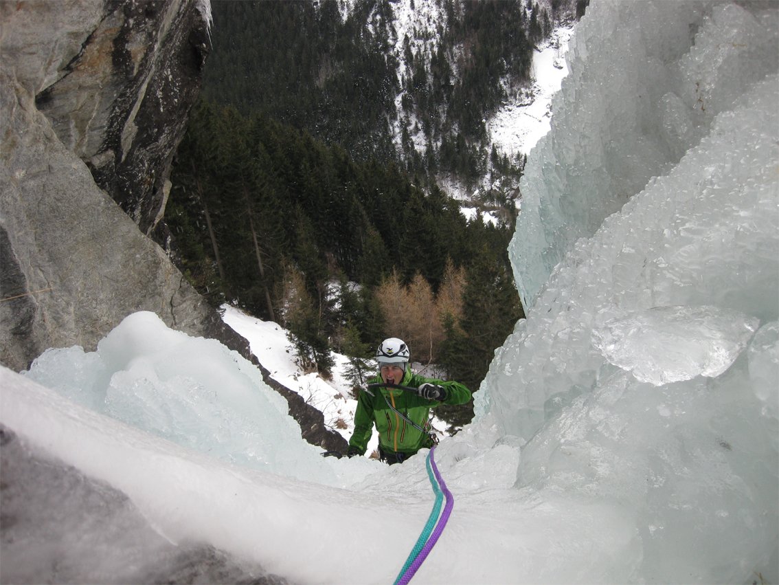 Die erste länge führt durch Kompacktes Eis bis zu einem kleinen Eisüberhang mit Gleschereis änlichen Formationen. Über diesen hinweg zum sehr guten Stand unter dem Felsdach. Zweite Seillänge über eine Röhreneissäule (nass) zum Ausstieg des Eispilzes.