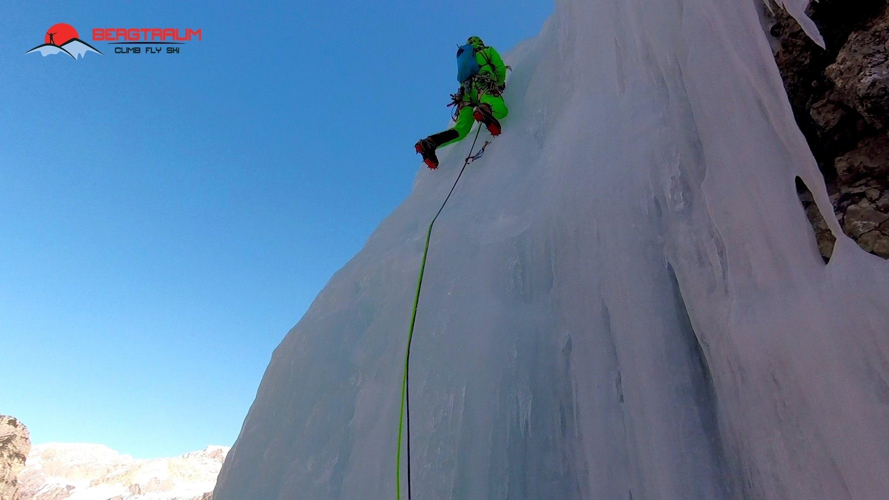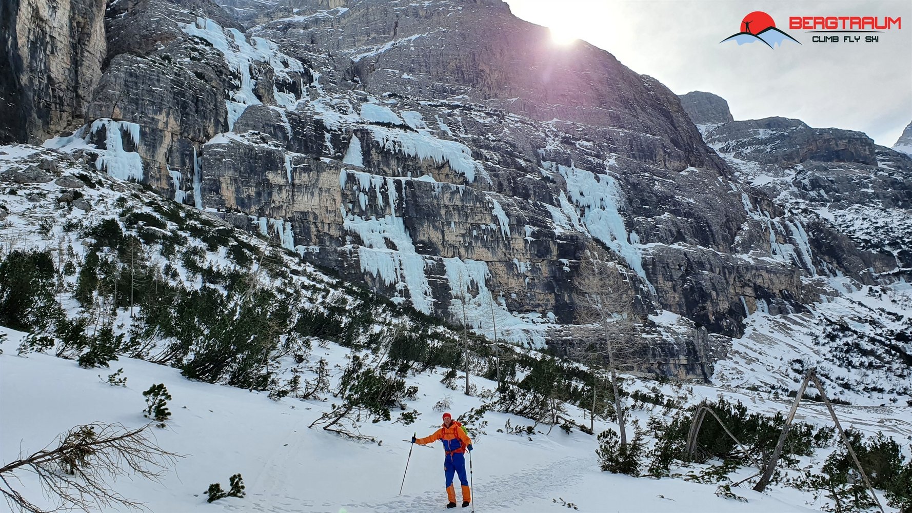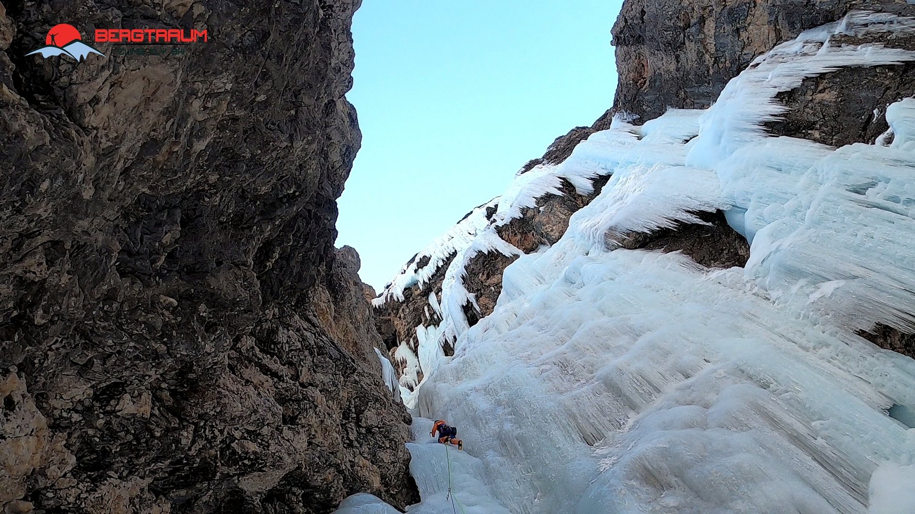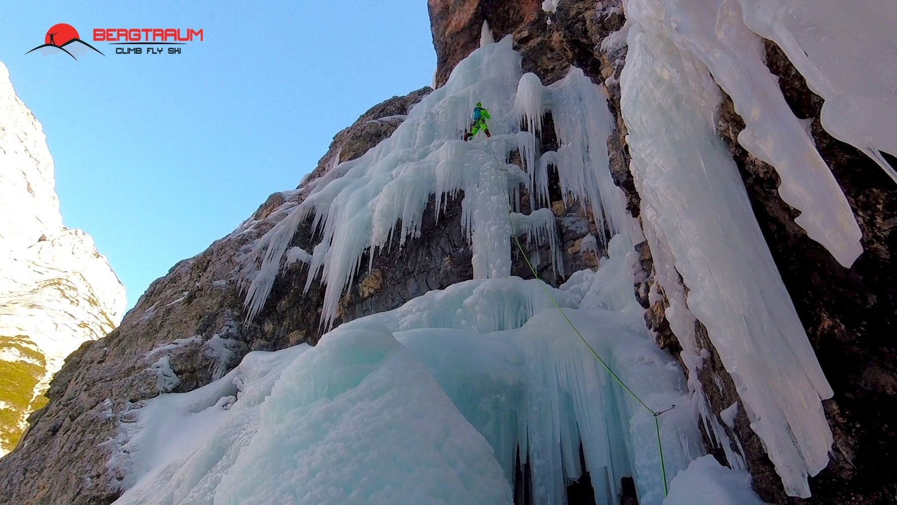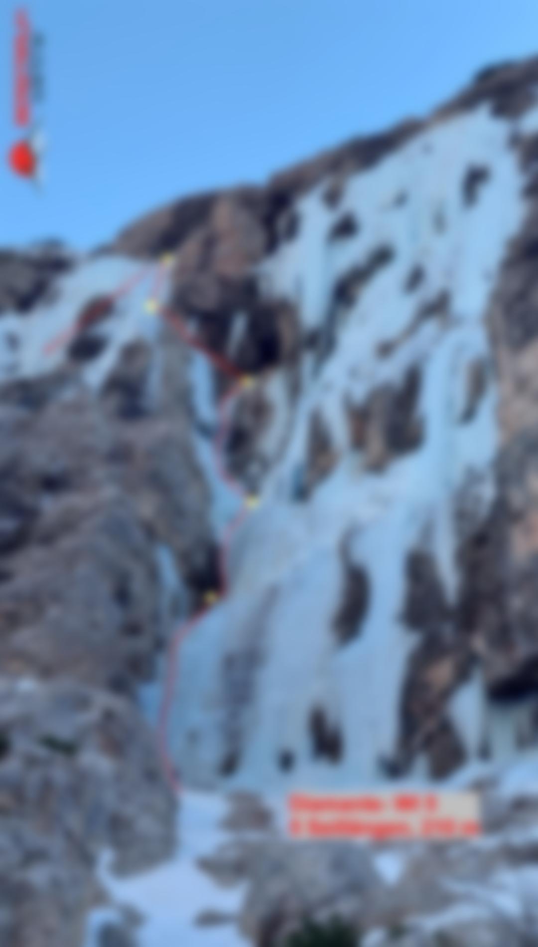 Wunderschöner Eisfall in imposanter Umgebung- Zustieg kann je nach Schneeverhältnissen lang und etwas unbequem sein. Mehrere Möglichkeiten zum Klettern in der dritten Seillänge. Ganz rechts gibt`s die Tour „Sogno Canadese“- WI 5 mit rund 200 m Länge.