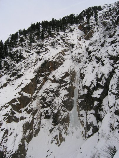 Interessante Routen ganz links im Grawa Eisgarten. Der linke Anstieg kann bei wenig Schnee verlängert werden (ca. 300m); der rechte Anstieg hat oben oft dünnes Eis.