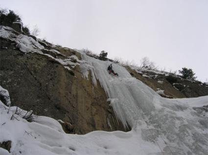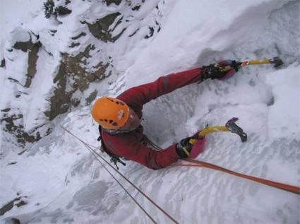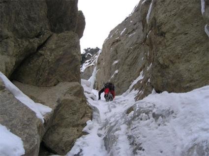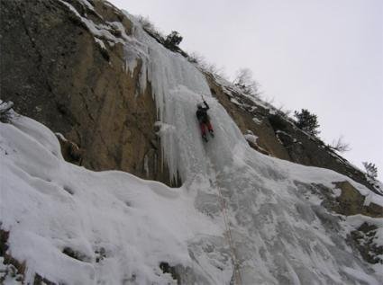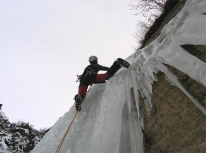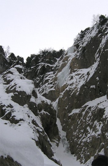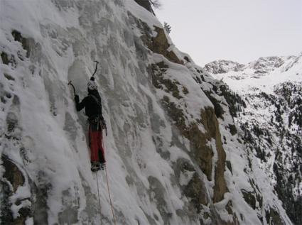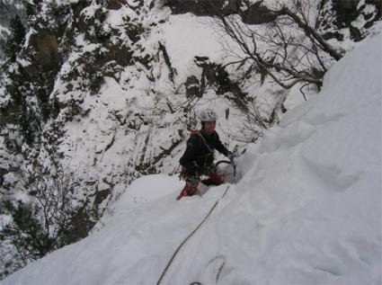 Linker "Linker Zwerg": Nach der ersten Seillänge abseilen (Eissanduhr) bzw. von ganz oben über links zuerst zu Fuß und dann abseilen (etwas alpine Erfahrung nötig!).