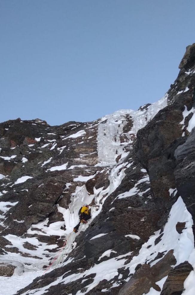 In ca. 2-3 Stunden den Wasserfall hinauf und die 20 km das Tal hineinradeln! Stirnlampe nicht vergessen (dunkler Tunnel). Zu Fuß in gut 5-6 Stunden Marschzeit zur Warnsdorfer Hütte. Die Hütte hat einen Winterraum. Von der Hütte Richtung Gamspitzl und zur gut erkennbaren Wand (Vorsicht Gletscherspalten!) - 2 Std. ab Warnsdorfer Hütte.