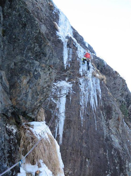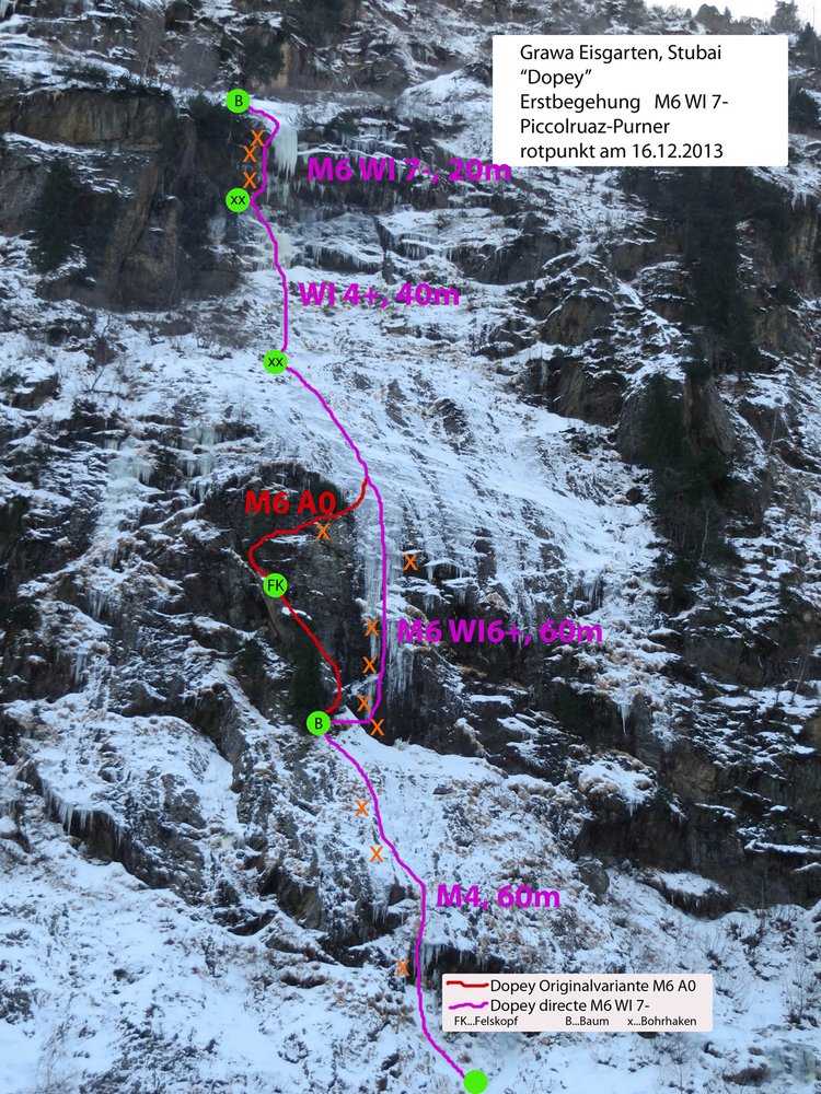 Knackige Mixedlinie im Grawa-Eisgarten. Abwechslungsreiche Mixkletterei, teils dünnes Eis, ausreichend mit Bohrhaken abgesichert, kurze Schrauben empfehlenswert.
