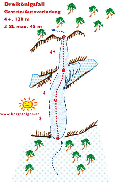 Der Dreikönigsfall ist von der Autoverladestelle in Böckstein gut zu sehen. Die Route hat oft hohe Lawinengefahr, obwohl sie im Wald liegt. Die Route ist anfangs gemütlich und breit, stellt sich gegen Ende dann steil und eng auf. Die erste Seillänge hat oft etw. dünnes Eis