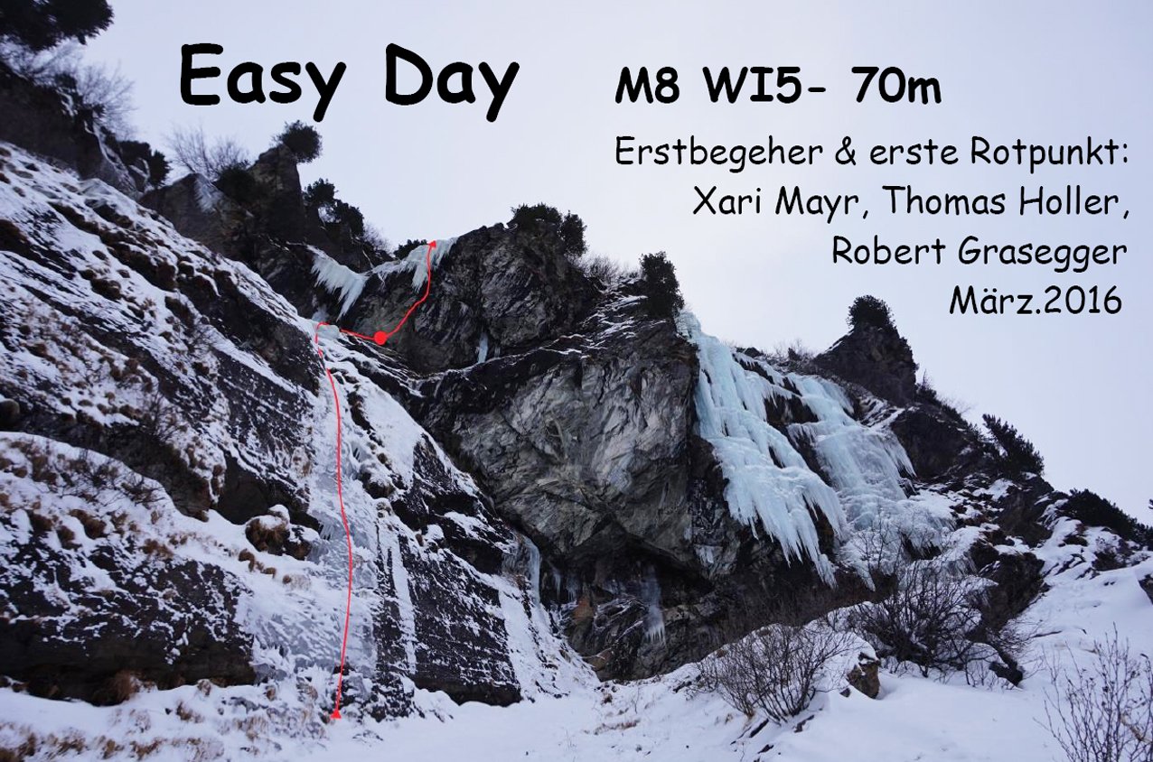 Steile und technische Kletterei an Leisten und Rissen. In der ersten Seillänge erinnert die Kletterei an die Eisgullys in Chamonix. Die Route befindet sich im oberen Easy Afternoon Sektor, zwischen den Routen Domenicus und Paracelsius und bietet Eis und Mixedkletterei (80m, M8, WI5-).