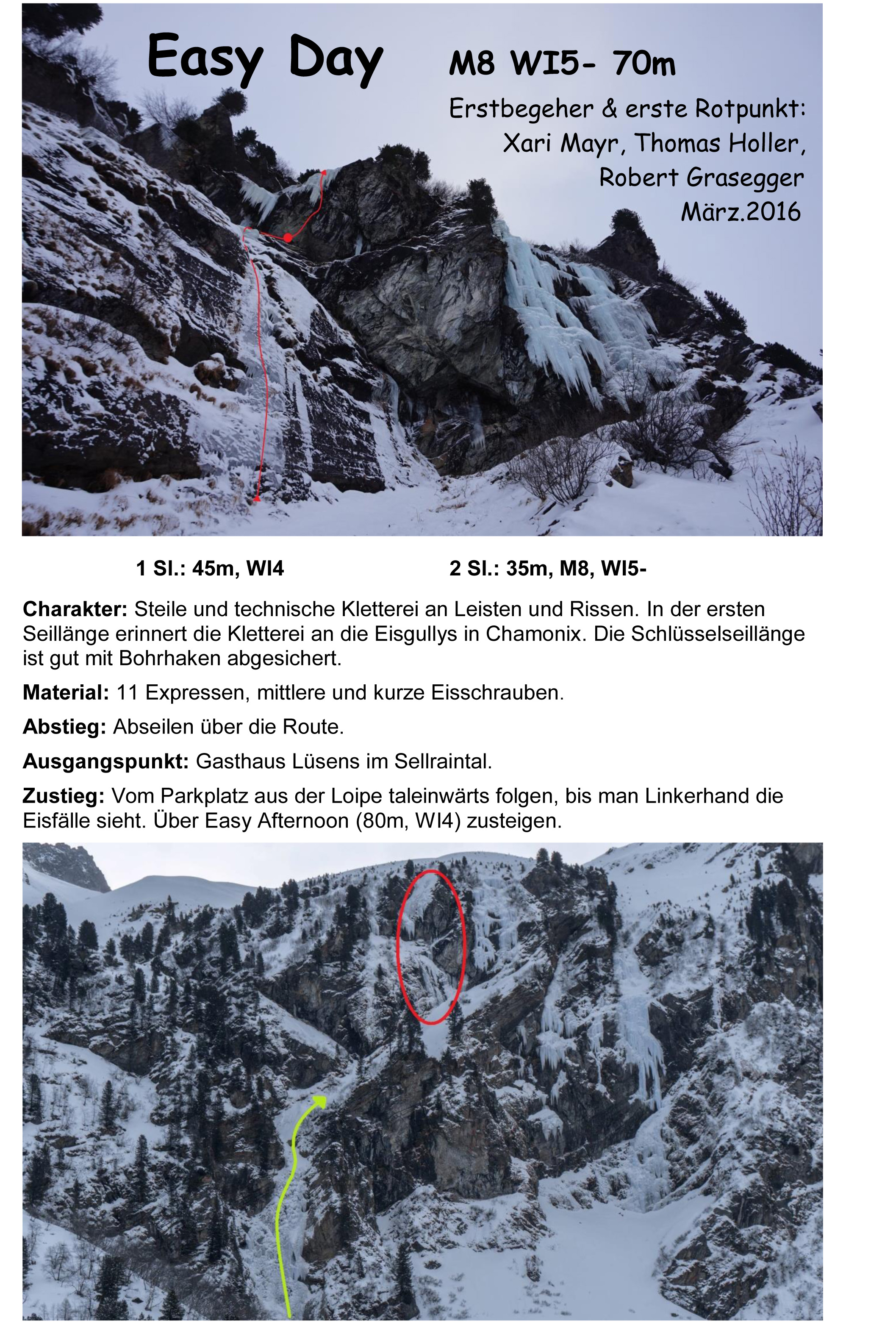 Vom Alpengasthof Lüsens immer der Fahrbahn (im Winter eine Loipe ) taleinwärts folgen bis man linker Hand die Eisfälle sieht. Über den leichten, breiten Eisfall "Easy Afternoon" (80 m; WI 4) zusteigen.