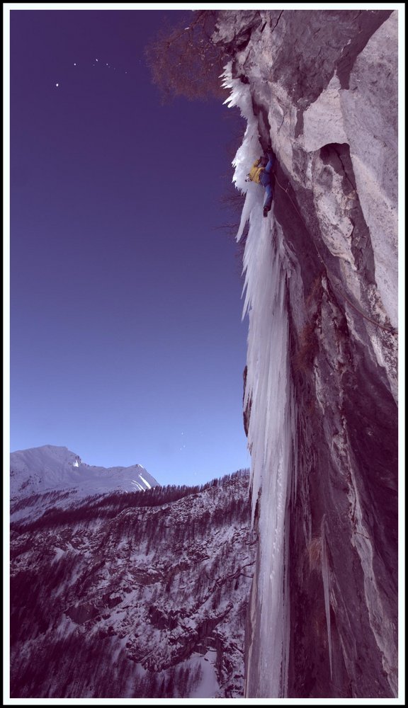 Expressschlingen, normale Eisausrüstung, 1 Satz Cams 0,3-3, 60 m Doppelseil. "Icemaster" ist mit Bohrhaken abgesichert (Detail siehe Topo).