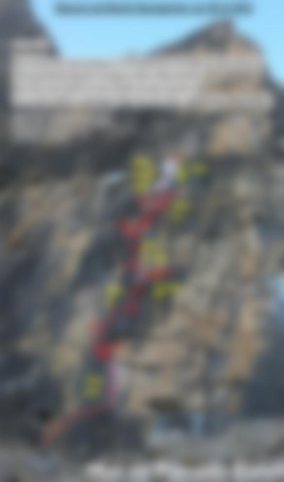 Die Tour folgt den ersten vier Seillängen der selten begangenen Schwarzen Wand Führe, die bereits 1967 von Steinkötter Heinz und Frismon Vitti eröffnet wurde. Bereits in der ersten Seillänge kamen die Eisgeräte zum Einsatz, die Schwierigkeit liegt bei ca. M5. Die vorhandenen alten Haken sollte man jedoch mit Vorsicht genießen. Die zweite Seillänge klettert man an perfekten schwarzen Fels ca. 30 m leicht rechtshaltent hoch. Auch hier trifft man auf alte Haken, man kann aber auch gut mobile Sicherungen legen. Die dritte Seillänge ist ein Mix aus Fels und Eis in der Schwierigkeit V/M5. In der vierten Seillänge befindet sich die schwierigste Felspassage der gesamten Tour. Diese folgt zuerst einen Riss zu einem kleinen Dach (die Schwierigkeit liegt ca. bei VI+) und bevor man zum Stand gelangt ist nochmals ein kleiner Eisaufschwung zu bewältigen. Die fünfte Seillänge führt zuerst unter der hängenden Eisformation links an leichtem Fels vorbei und quert dann direkt ins Eis. An diesem Punkt verlässt man die „Schwarze Wand“ Führe. Die kurze Felspassage kann man gut an Sanduhren und mit Friends absichern. Der eigentliche Eisfall ist dann ein Genuss zum klettern und weist von unten bis oben immer dieselbe Schwierigkeit auf - ca. WI6.
