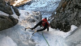 Vom Stand links haltend hinauf zum Beginn des Felspfeilers. Dort ist ein Stand an 2 Bohrhaken. Wenn dieser mit Schnee bedeckt sind, weiter nach links queren und einen Stand mit Eisschrauben machen.