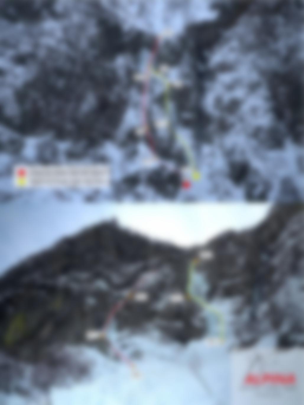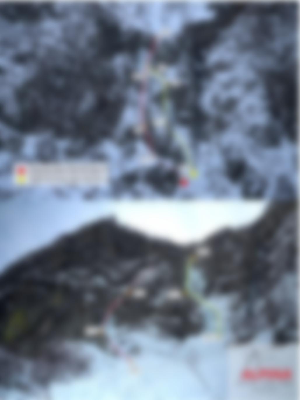 Vom Stand links haltend hinauf zum Beginn des Felspfeilers. Dort ist ein Stand an 2 Bohrhaken. Wenn dieser mit Schnee bedeckt sind, weiter nach links queren und einen Stand mit Eisschrauben machen.