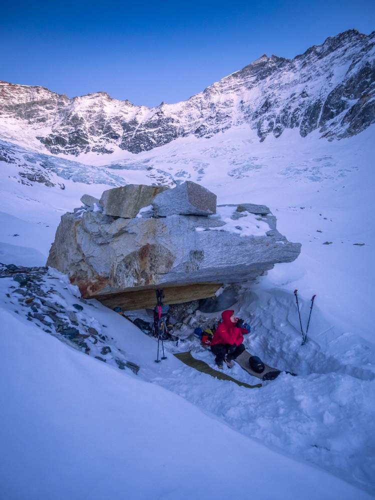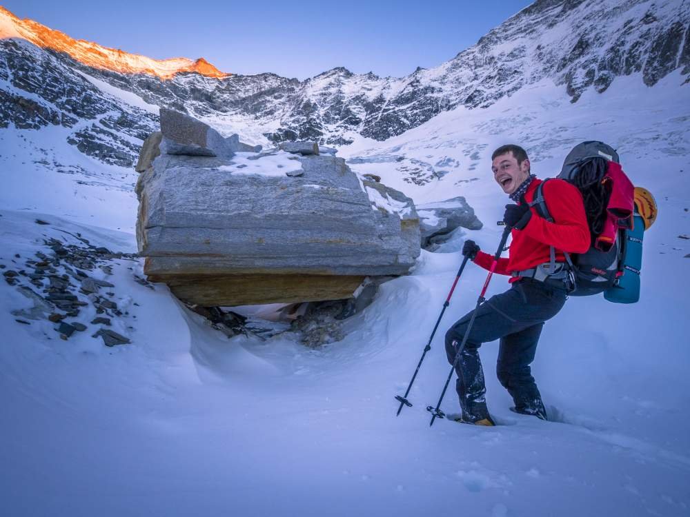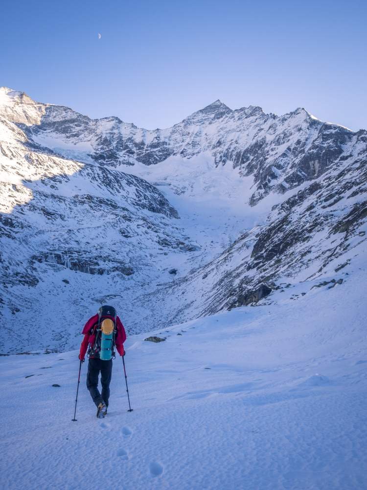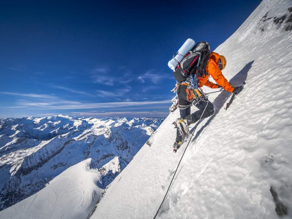 Steiles Firneis und leichter bis mittelschwerer Bruch sollten sicher beherrscht werden, da nicht immer eine zuverlässige Sicherung möglich ist.