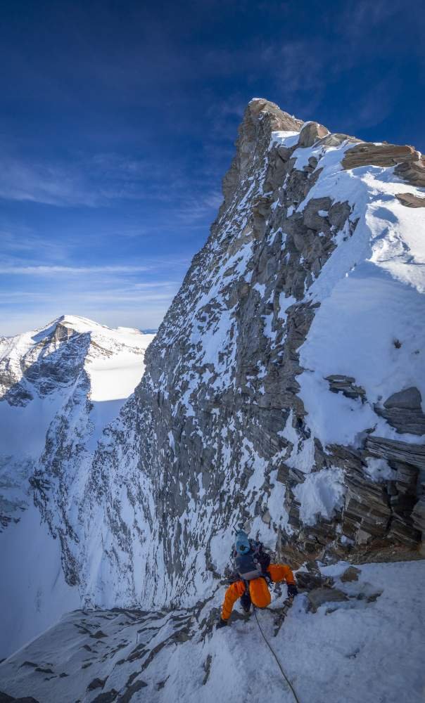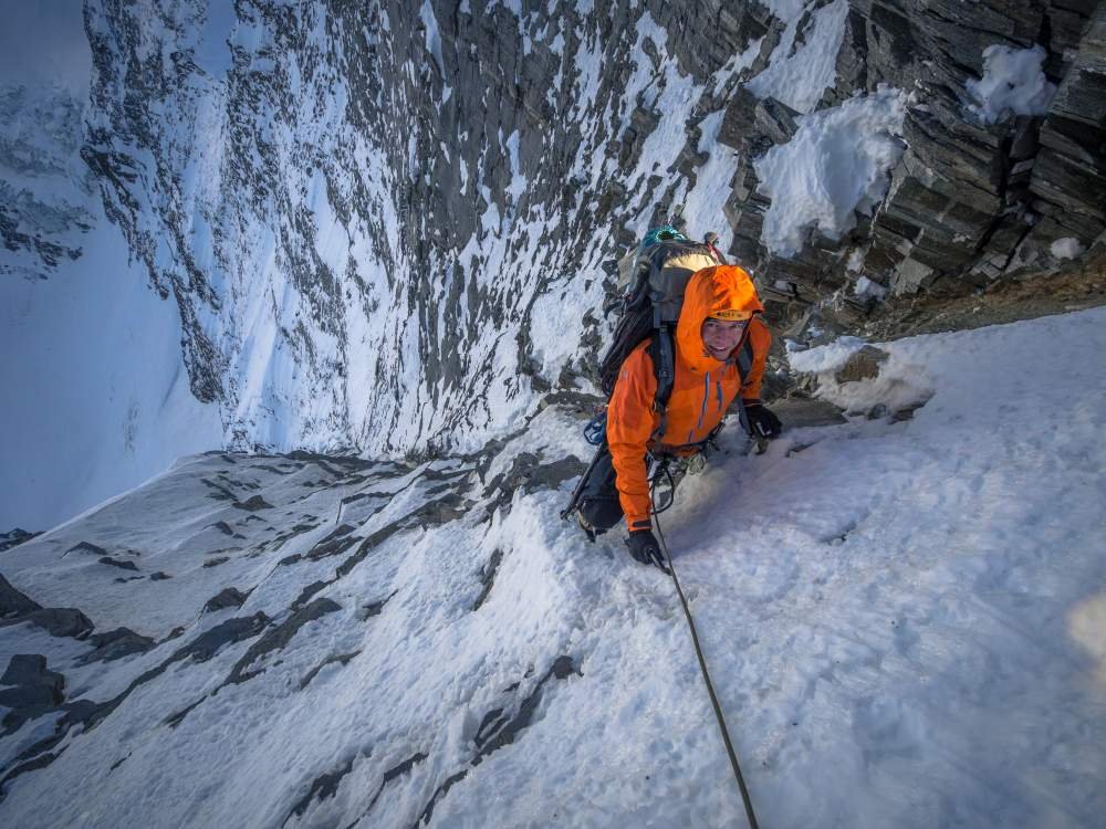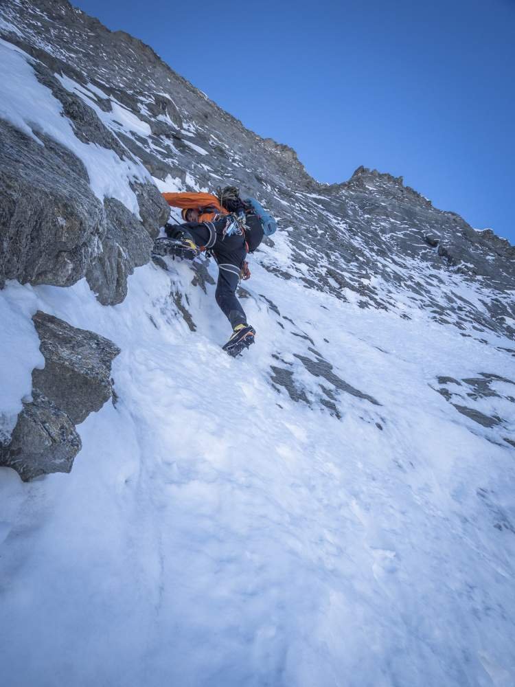 Komplette Gletscherausrüstung, Halbseile, Eisgeräte. Friends und Keile nur bedingt einsetzbar, ein ausgedehntes Hakensortiment (v.a. Messerhaken und ein paar Fichtlhaken) sollte unbedingt dabei sein. Bei viel Firn (12/16) konnten einige Stände nur dank einem 60 cm Firnschwert bezogen werden. Wegen der Abgelegenheit Ski- und/oder Biwakausrüstung mitnehmen.