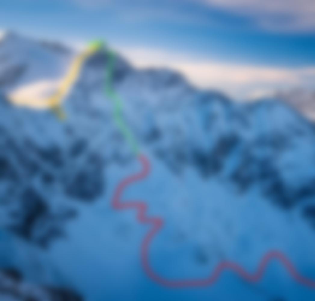 Die Route folgt dem offensichtlichsten Couloir bis in die Wandmitte und zieht anschließend durch die markante Gipfelschlucht zum Grat, knapp unterhalb des Gipfels. Die erste klettertechnische Schwierigkeit liegt in einer Steilstufe oberhalb des Bergschrundes (im verfirnten Zustand 90° steil). Nach dem ersten Wanddrittel versperrt eine weitere 80-85° steile Stufe das Couloir, ohne Firn ggf. brüchig. Anschließend klettert man eine leichte Rechtsschleife und gelangt über flacheres (ohne Firn vermutlich plattiges!) Gelände in die große Gipfelschlucht, der man dann folgt. Auf den letzten 70 Metern steilt das Couloir auf und wird extrem brüchig. Den Grataufschwung zum Gipfel umgeht man in einer weiten Rechtsschleife.